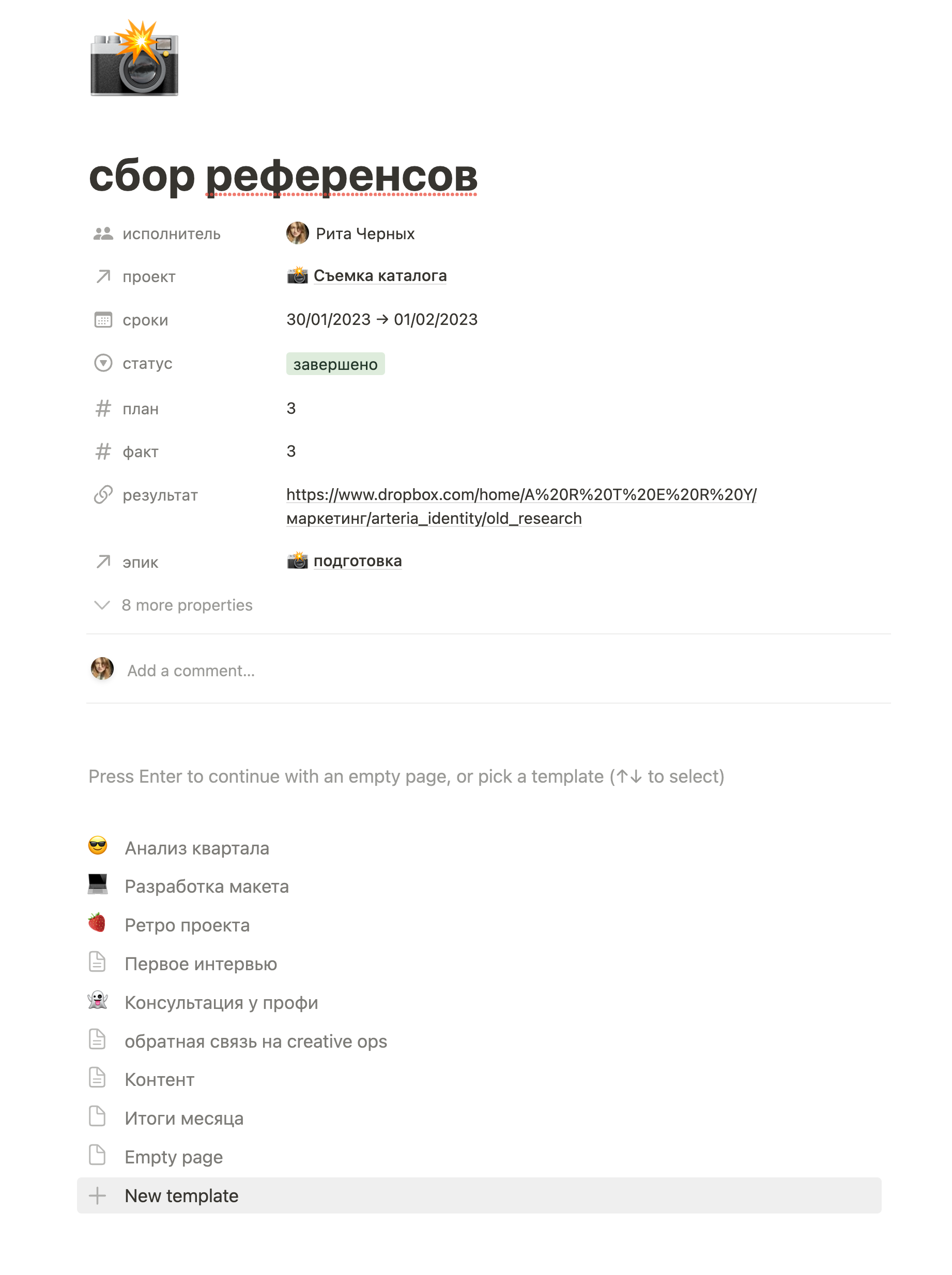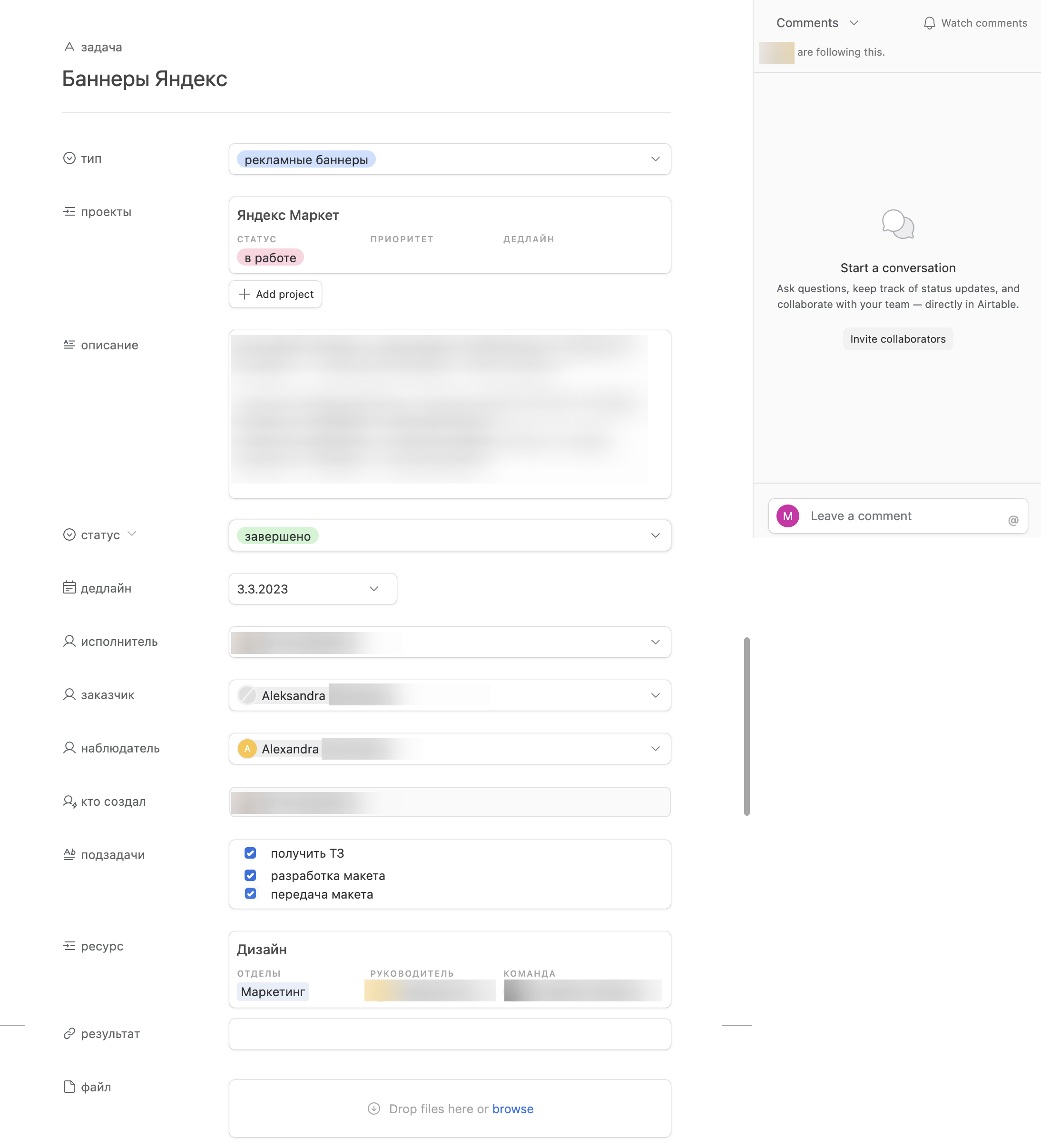 Довольно сильно отличаются и внутренние страницы базы данных. В Notion внизу есть пустое пространство, в которое мы можем добавить любую информацию, линк на базу, комментарии и т.д. В Airtable нет пустого поля для самостоятельного наполнения, а поле с комментариями всегда находится в правой части карточки. Ну и сам интерфейс Airtable более «шумный» из-за лишних элементов, типо рамок, подложен фона и т.д.