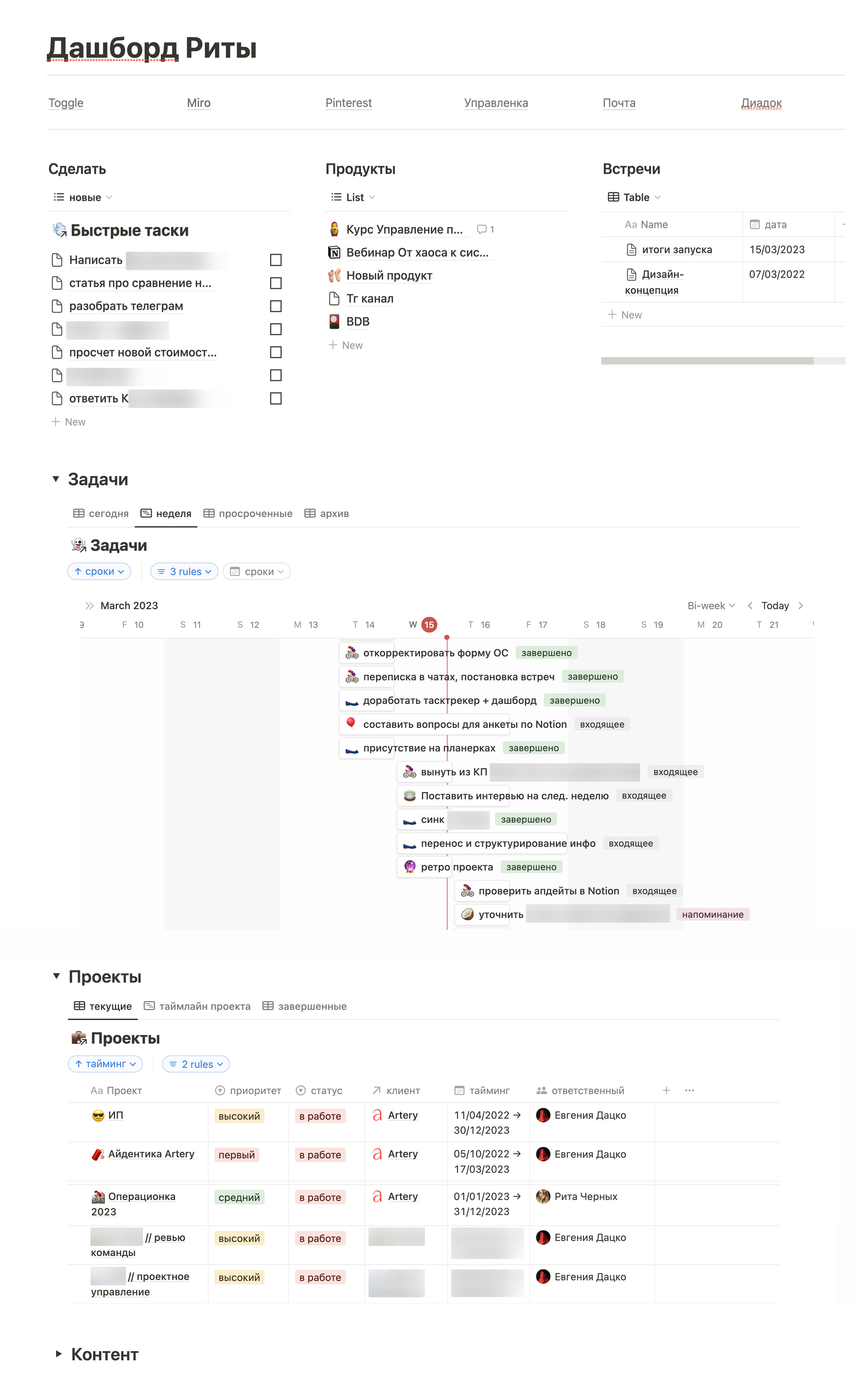 В Notion можно собирать отдельные страницы под конкретные задачи со всеми нужными базами, фильтрами и вариантами отображения. Например, страница для проведения планерок всей компании: где будет таймлайн всех проектов, конспекты встреч за последнюю неделю, задачи по людям или по отделам. Благодаря такой странице не нужно никуда переключаться, все всегда под рукой в нужном виде. Или страница сотрудника, где у него задачи на день, задачи на неделю, проекты в работы, популярные ссылки и т.д.