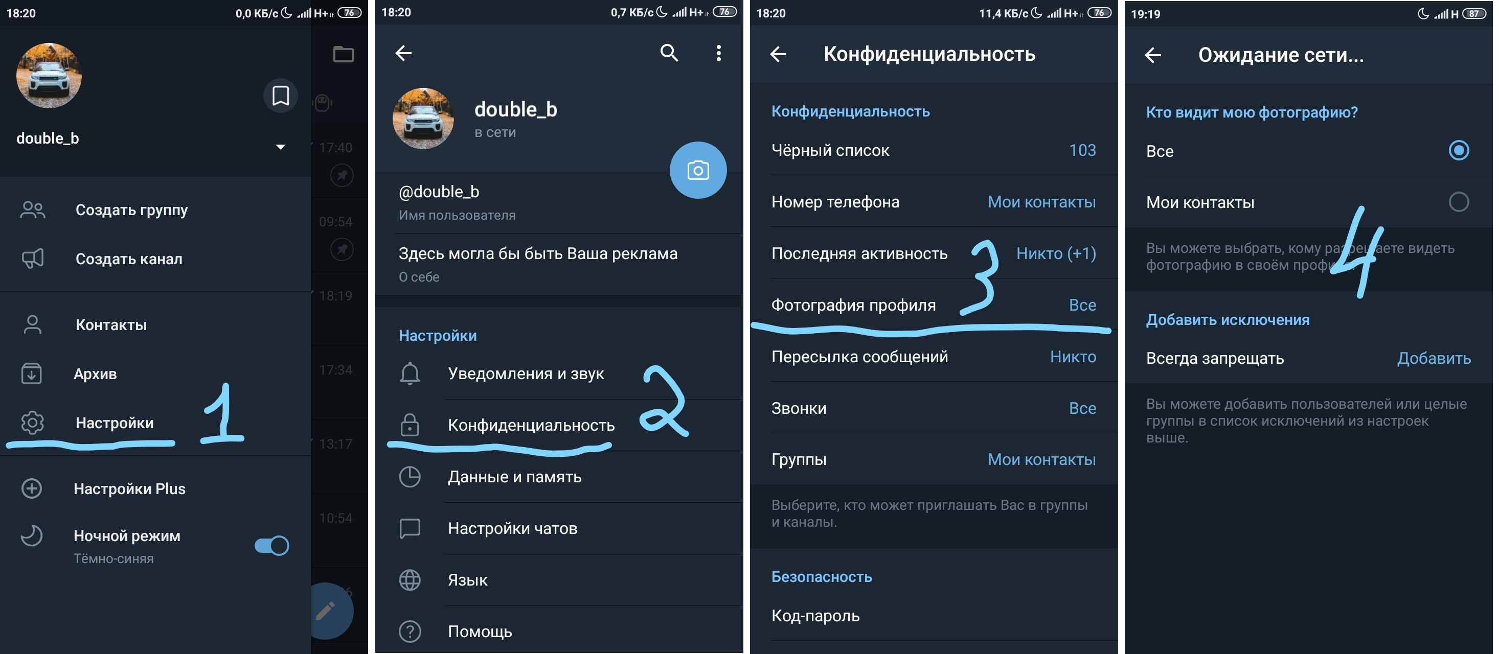 Всегда запрещать - Добавить tugmasini bosib, o'ziz xoxlagan kontaktlarni tanlesiz - va ularga sizi profil rasmingiz umuman ko'rinmaydi.