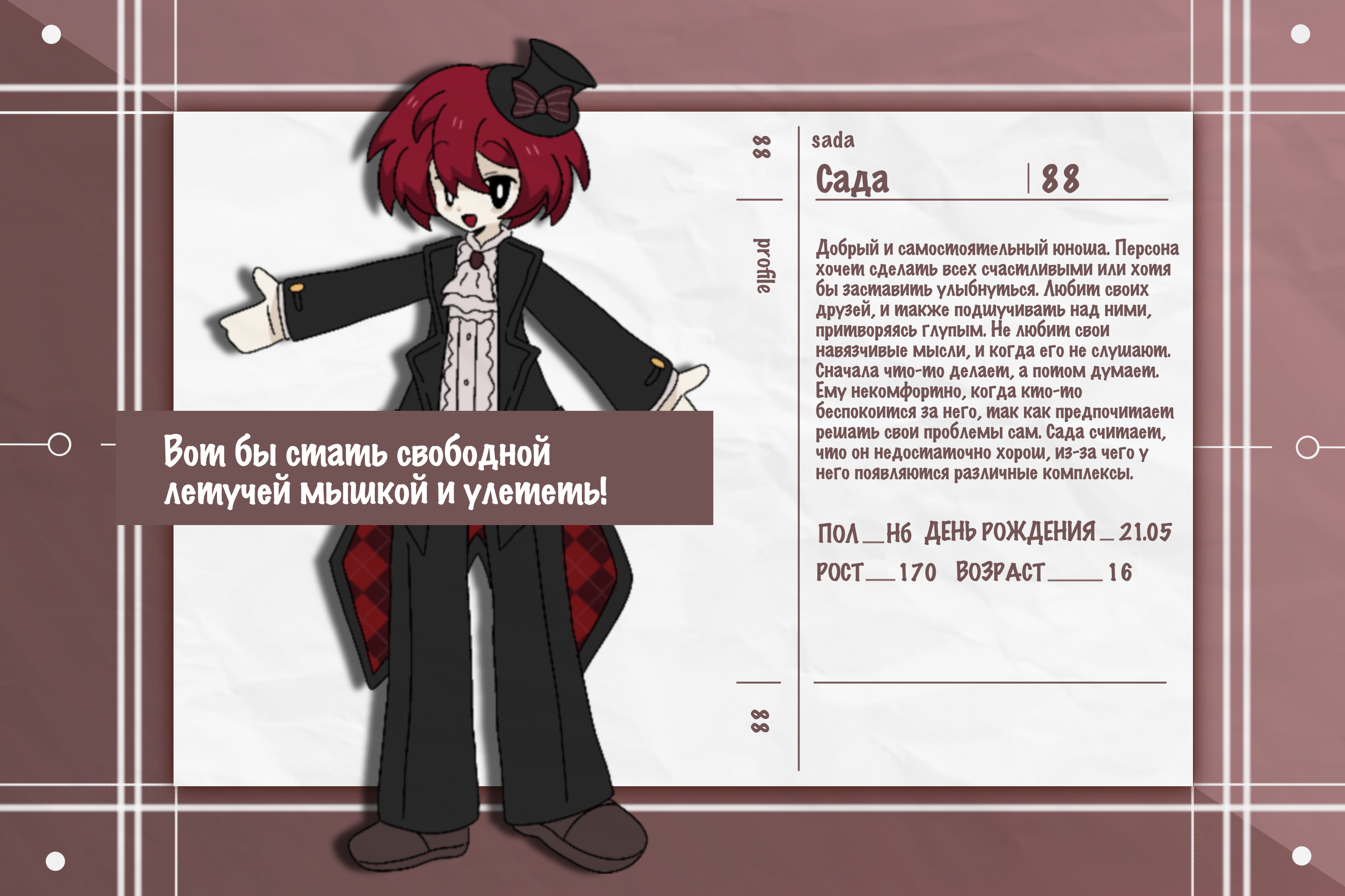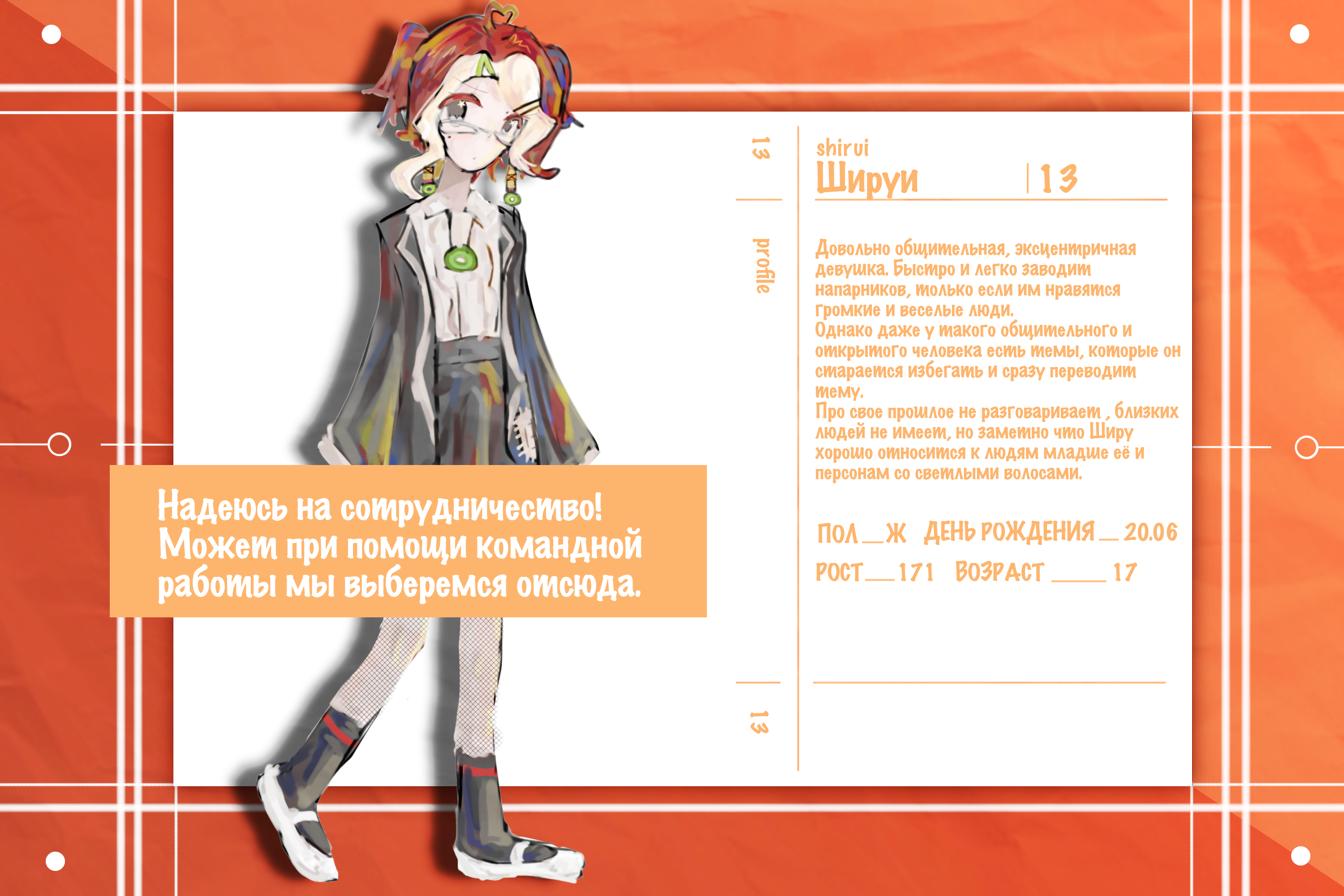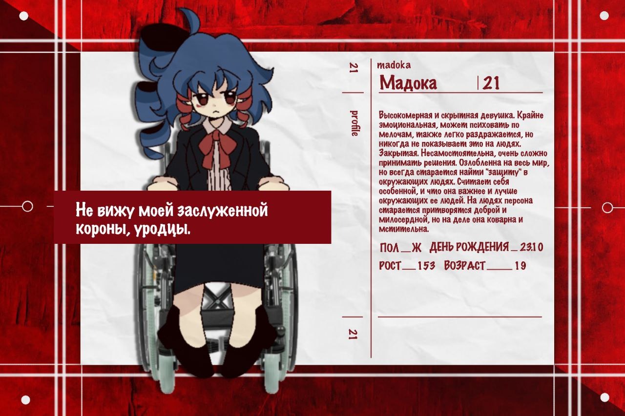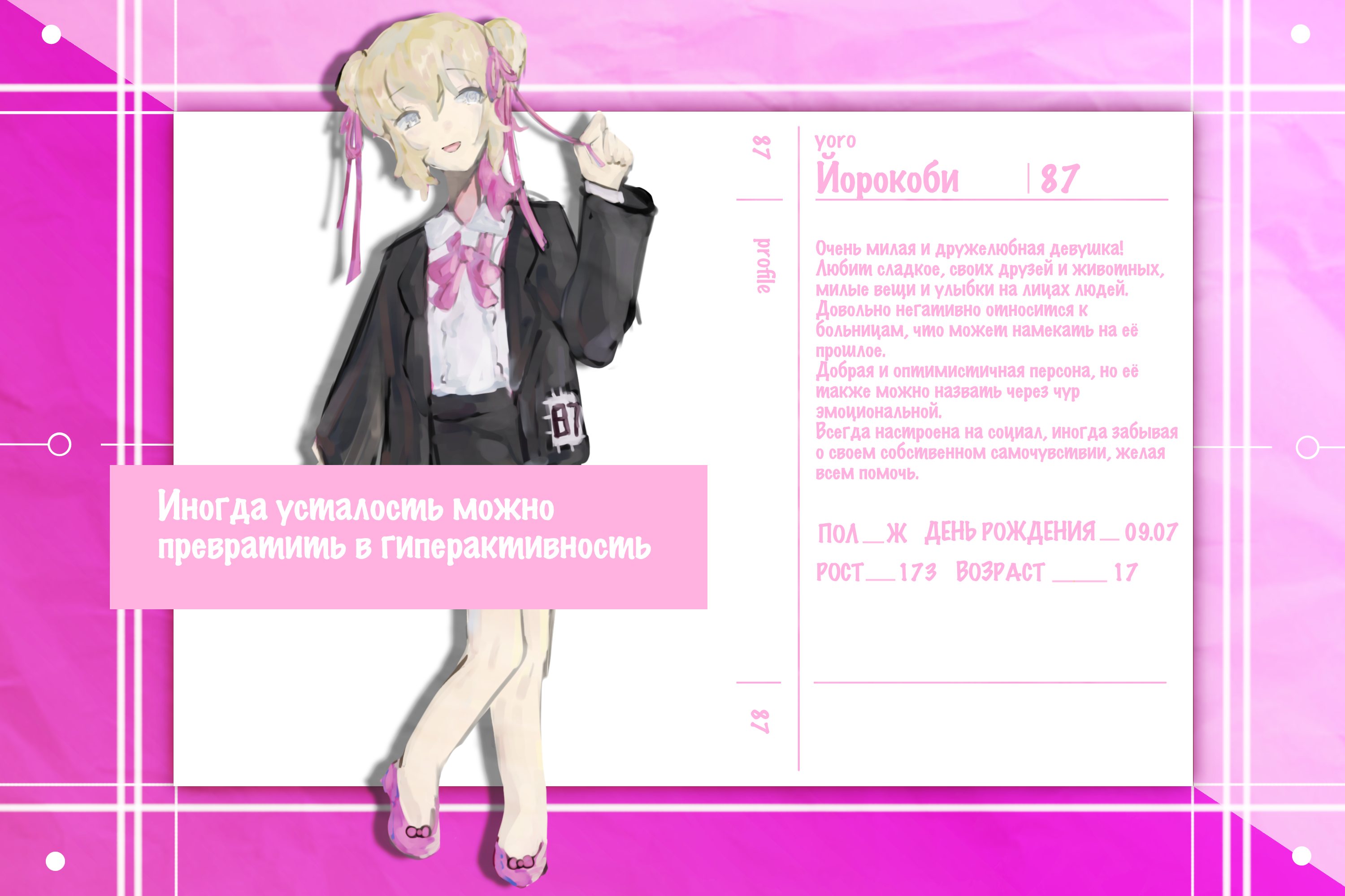 Очень милая и дружелюбная девушка! Любит сладкое, своих друзей и животных, милые вещи и улыбки на лицах людей. Довольно негативно относится к больницам, что может намекать на её прошлое. Добрая и оптимистичная персона, но её также можно назвать через чур эмоциональной. Всегда настроена на социал, иногда забывая о своем собственном самочувствии, желая Всем помочь.