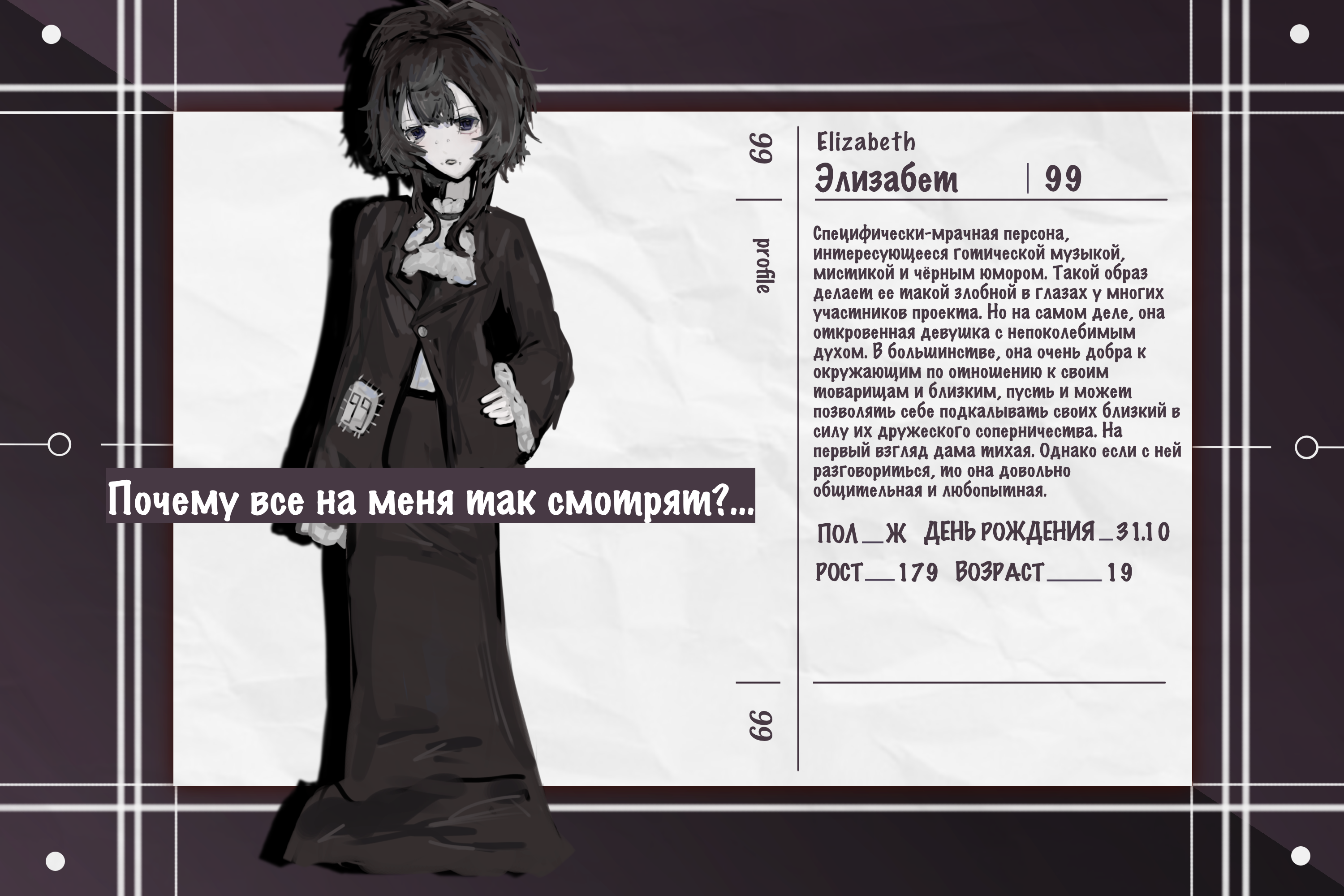 Элизабет высокого роста, у нее острый и ясный взгляд. Специфически-мрачный образ, интерес к готической музыке, мистике, чёрному юмору делает ее такой злобной на вид в глазах у многих участников проекта. Но на самом деле, Бетти откровенная девушка с непоколебимым духом. В большинстве, она очень добра к окружающим по отношению к своим товарищам и близким, пусть и может позволять себе подкалывать своих близких в силу их дружеского соперничества. На первый взгляд дама тихая. Однако если с ней разговориться, то она довольно общительная и любопытная.