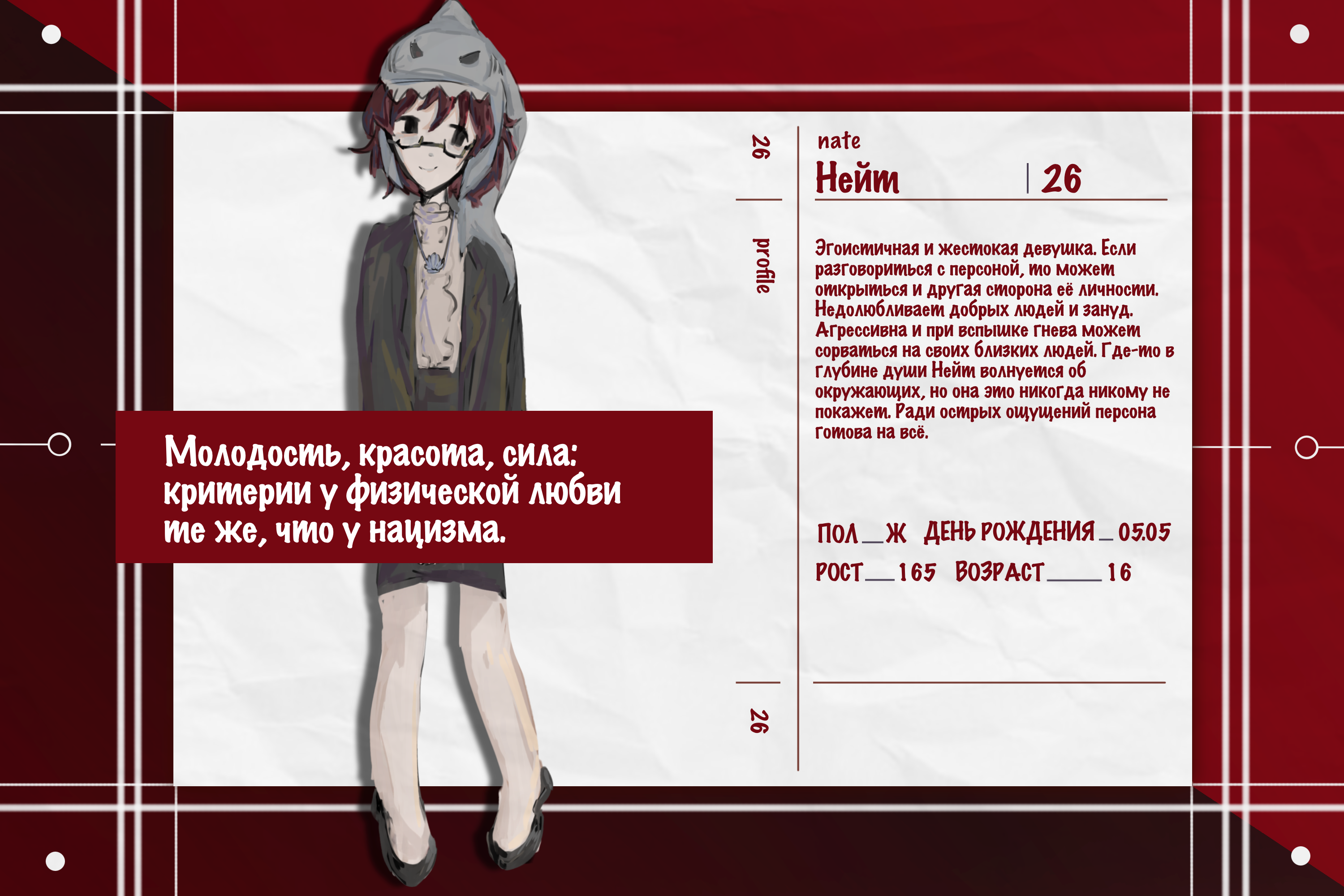 Высокомерная и скрытная девушка. Крайне эмоциональная, может психовать по мелочам, также легко раздражается, но никогда не показывает это на людях. Персона очень закрытая, никогда не говорит о своих собственных чувствах открыто даже с близкими. Несамостоятельна, очень сложно принимать решения. Озлобленна на весь мир, но всегда старается найти "защиту" в окружающих людях. Считает себя особенной, и что она важнее и лучше окружающих ее людей. На людях персона старается притворятся доброй и милосердной, но на деле она коварна и мстительна.