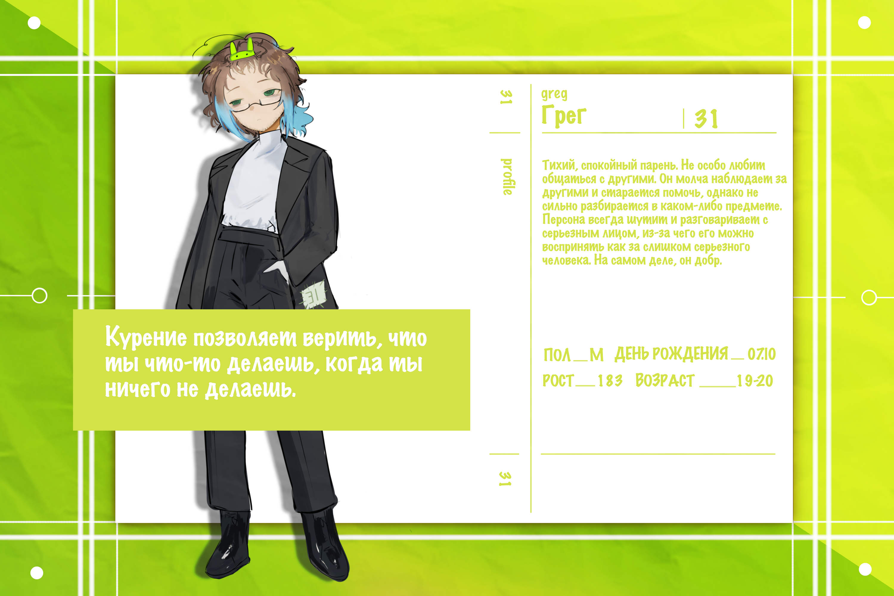 Тихий, спокойный парень. Не особо любит общаться с другими. Он молча наблюдает за другими и старается помочь, однако не сильно разбирается в каком-либо предмете. Персона всегда шутит и разговаривет с серьезным лицом, из-за чего его можно воспринять как слишком серьезного человека. На самом деле, он добр.