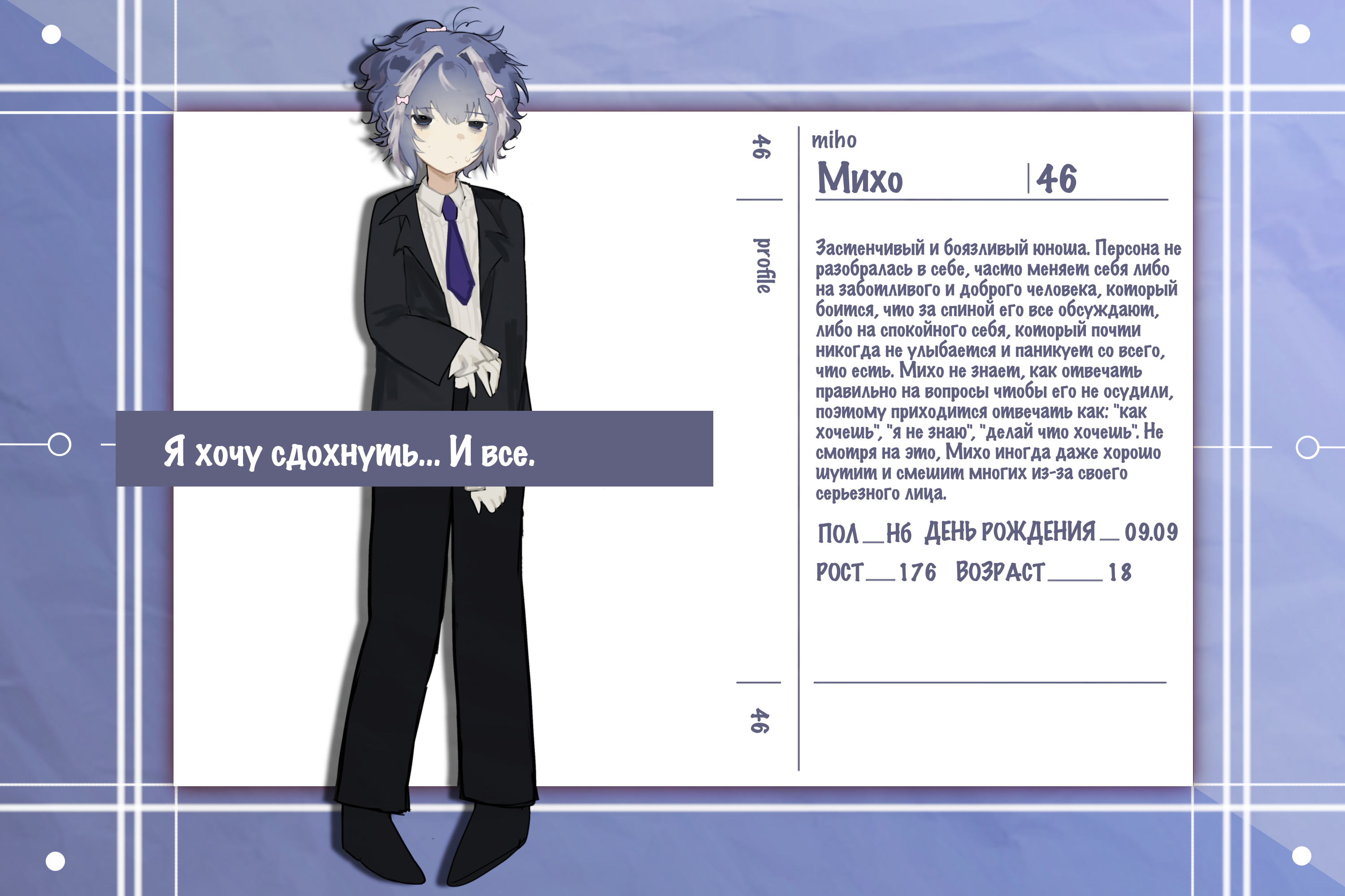 Застенчивый и боязливый юноша. Персона не разобралась в себе, часто меняет себя либо на заботливого и доброго человека, который боится, что за спиной его все обсуждают, либо на спокойного себя, который почти никогда не улыбается и паникует со всего, что есть. Михо не знает, как отвечать правильно на вопросы чтобы его не осудили, поэтому приходится отвечать как: "как хочешь", "я не знаю", "делай что хочешь".