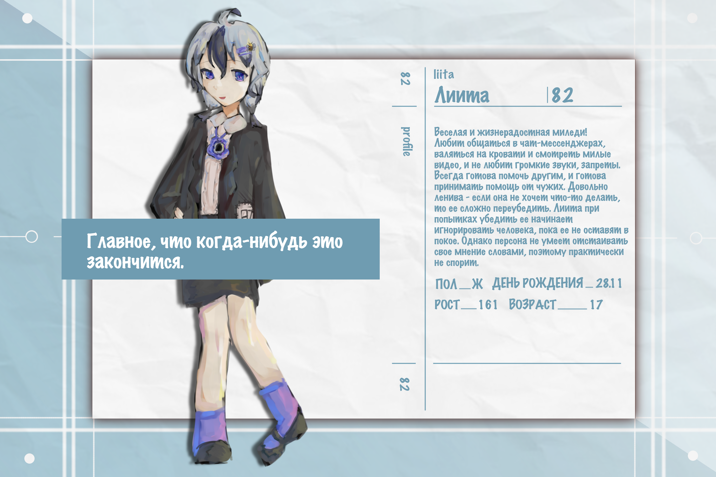 Веселая и жизнерадостная миледи! Любит общаться в чат-мессенджерах, валяться на кровати и смотреть милые видео, и не любит громкие звуки, запреты. Всегда готова помочь другим, и готова принимать помощь от чужих. Довольно ленива - если она не хочет что-то делать, то ее сложно переубедить. Лиита при попытках убедить ее начинает игнорировать человека, пока ее не оставят в покое. Персона не умеет отстаивать свое мнение, поэтому практически не спорит.