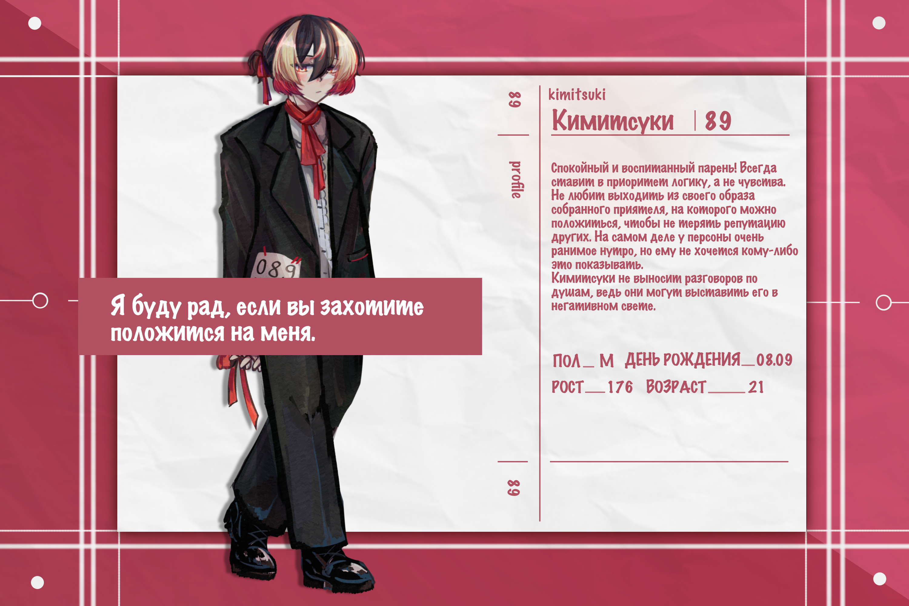 Спокойный и воспитанный парень. Всегда ставит в приоритет логику, а не чувства. Не любит выходить из своего образа собранного приятеля, на которого можно положиться, чтобы не терять репутацию других. На самом деле у персоны очень ранимое нутро, но ему не хочется кому-либо это показывать. Кимитсуки не выносит разговоров по душам, ведь они могут выставить его в негативном свете.