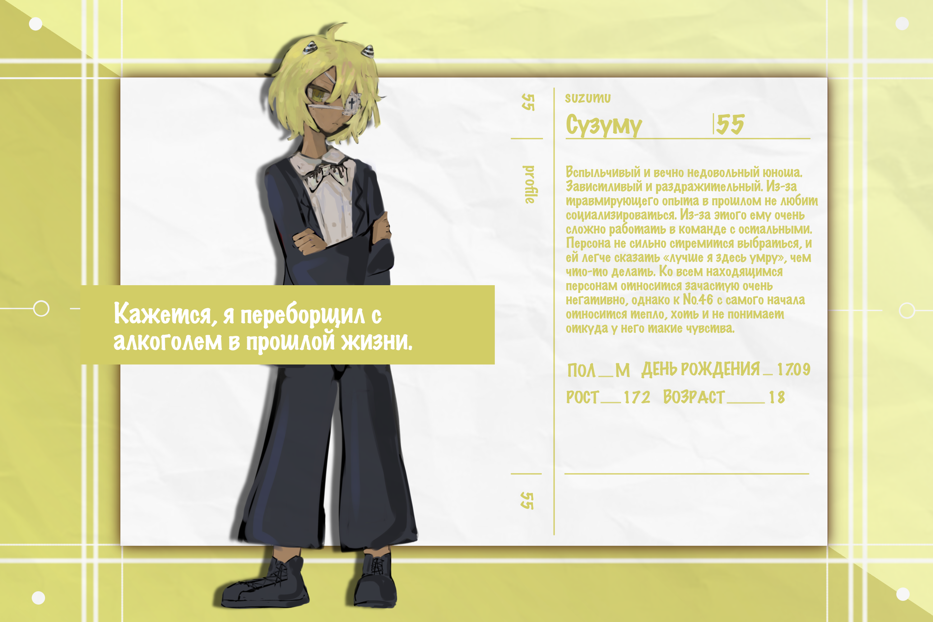 Вспыльчивый и вечно недовольный юноша. Завистливый и раздражительный. Из-за травмирующего опыта в прошлом не любит социализироваться. Из-за этого ему очень сложно работать в команде с остальными. Персона не сильно стремится выбраться, и ей легче сказать «лучше я здесь умру», чем что-то делать. Ко всем находящимся персонам относится зачастую очень негативно, однако к №46 с самого начала относится тепло, хоть и не понимает откуда у него такие чувства. Довольно ревнив. Злоупотреблял алкоголем в прошлой жизни, из-за чего сейчас у него «ломка».