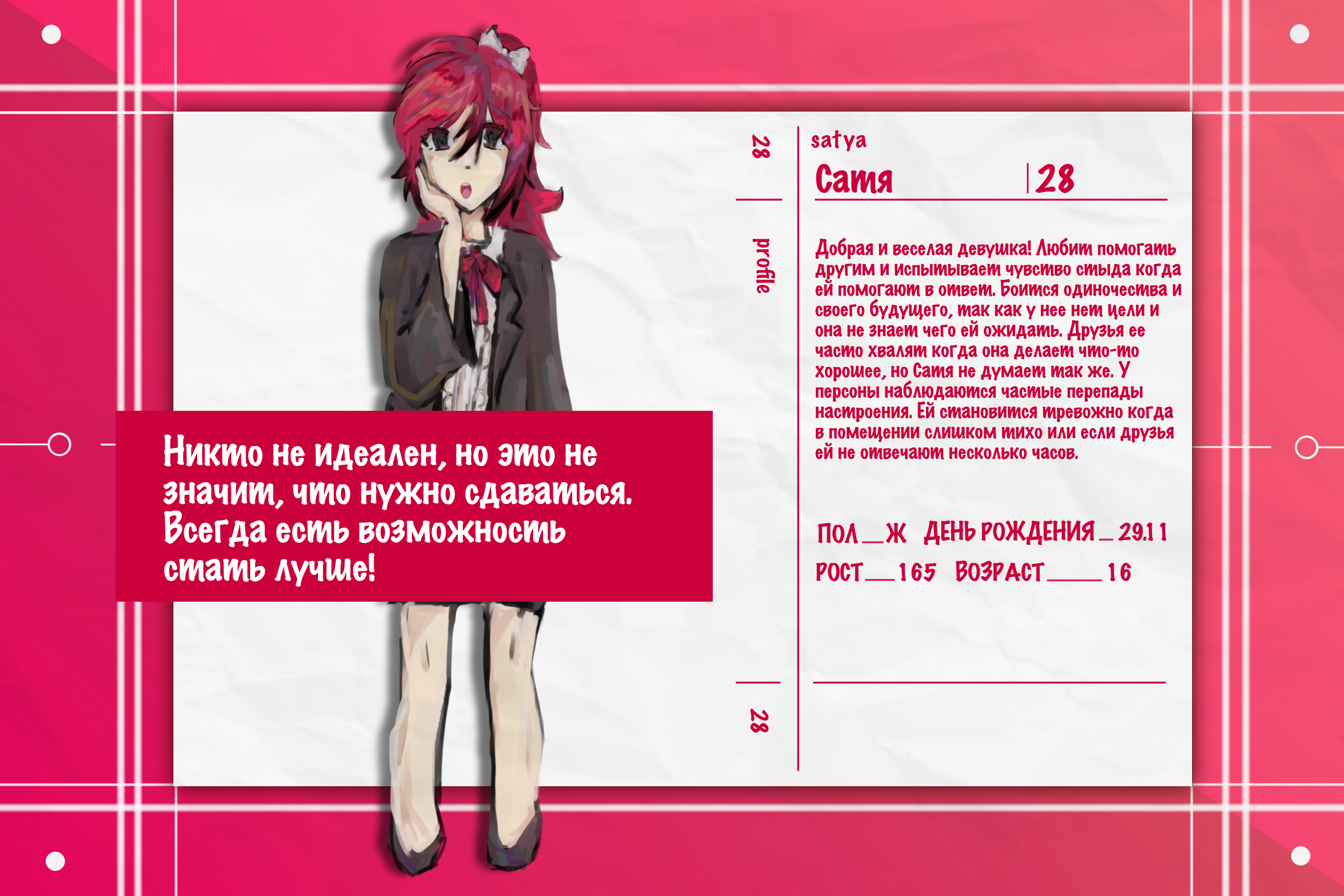 Добрая и веселая девушка! Любит помогать другим и испытывает чувство стыда когда ей помогают в ответ. Боится одиночества и своего будущего, так как у нее нет цели и она не знает чего ей ожидать. Друзья ее часто хвалят когда она делает что-то хорошее, но Сатя не думает так же. У персоны наблюдаются частые перепады настроения. Ей становится тревожно когда в помещении слишком тихо или если друзья ей не отвечают несколько часов.