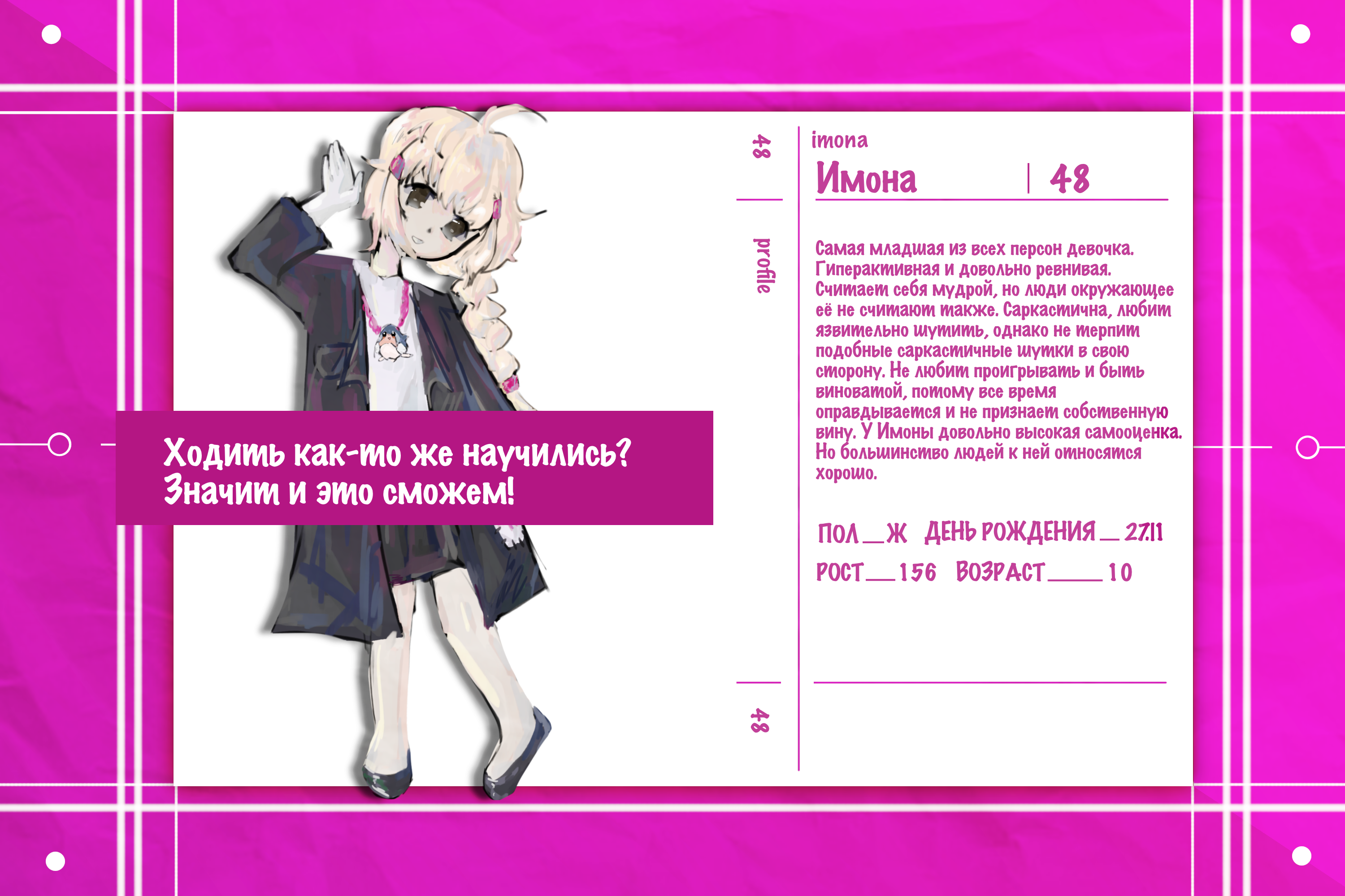 Самая младшая из всех персон девочка. Гиперактивная и довольно ревнивая. Считает себя мудрой, но люди окружающее её не считают также. Саркастична, любит язвительно шутить, однако не терпим подобные саркастичные шутки в свою сторону. Не любит проигрывать и быть виноватой, потому все время оправдывается и не признает собственную вину. У Имоны довольно высокая самооценка. Но большинство людей к ней относятся хорошо.