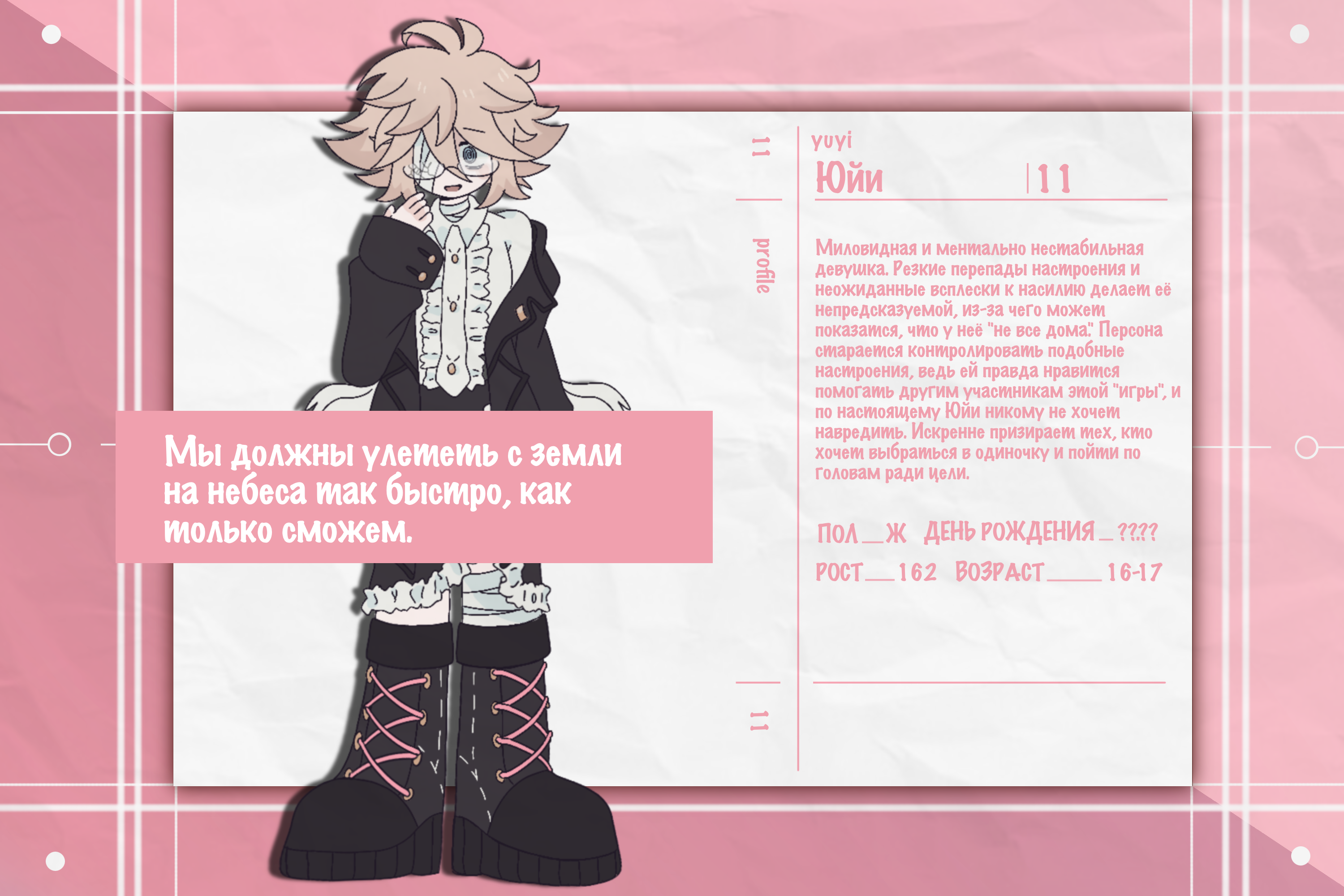 Миловидная и ментально нестабильная девушка. Резкие перепады настроения и неожиданные всплески к насилию делает её непредсказуемой, из-за чего может показатся, что у неё "не все дома." Персона старается контролировать подобные настроения, ведь ей правда нравится помогать другим участникам этой "игры", и по настоящему Юйи никому не хочет навредить. Искренне призирает тех, кто хочет выбраться в одиночку и пойти по головам ради цели.