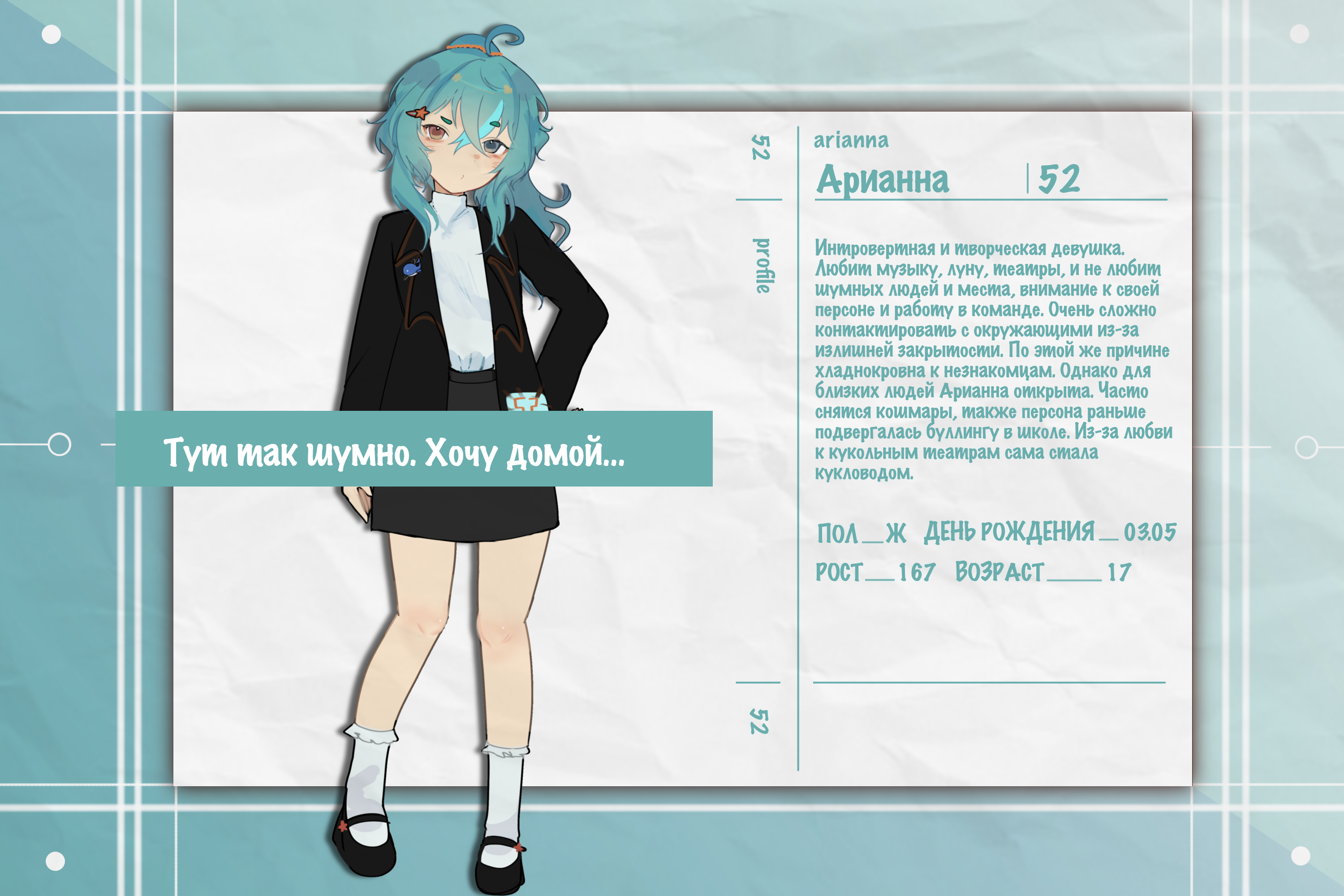 Интровертная и творческая девушка. Любит музыку, луну, театры, и не любит шумных людей и места, внимание к своей персоне и работу в команде. Очень сложно контактировать с окружающими из-за излишней закрытости. По этой же причине хладнокровна к незнакомцам. Однако для близких людей Арианна открыта. Часто снятся кошмары, также персона раньше подвергалась буллингу в школе. Из-за любви к кукольным театрам сама стала кукловодом.