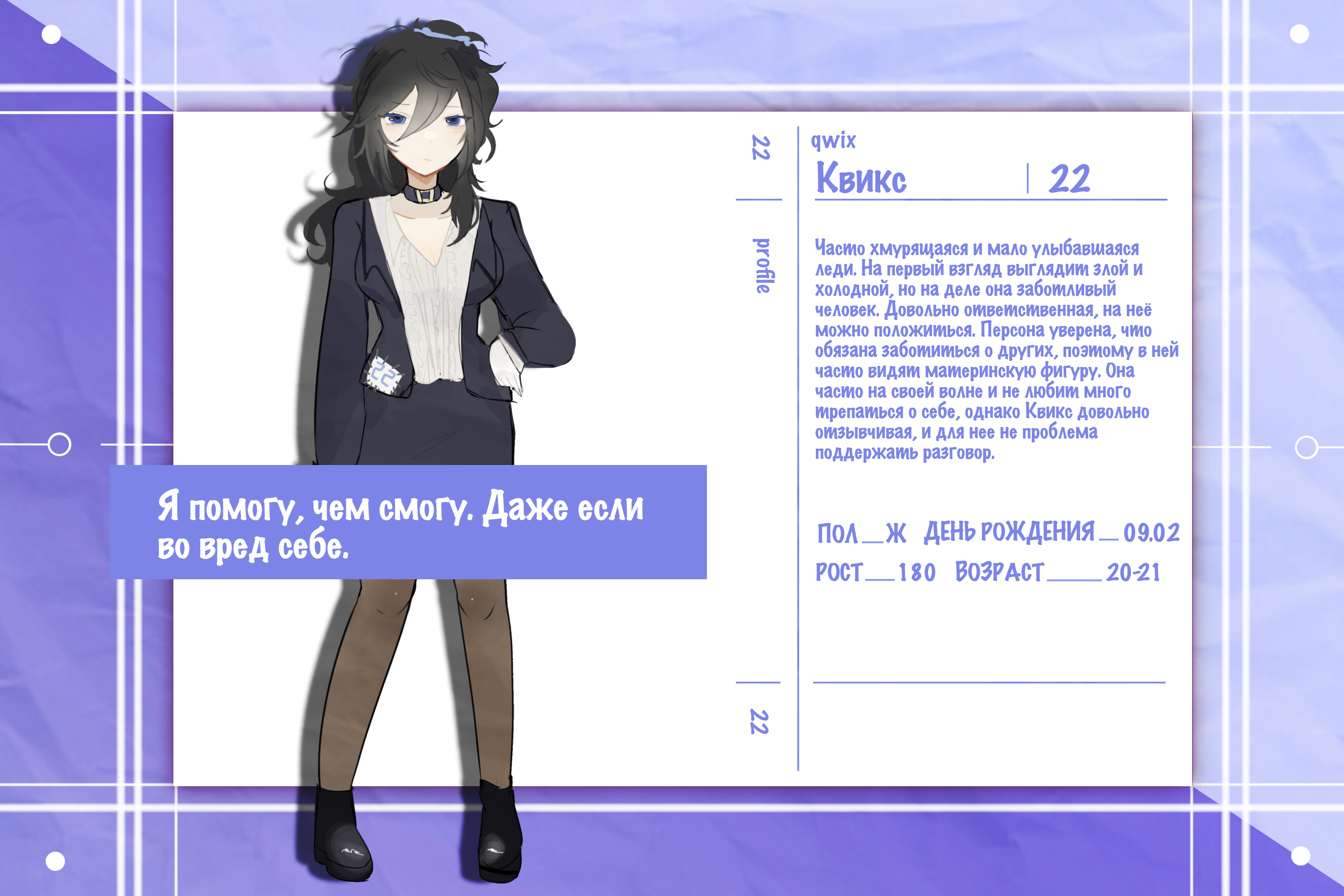 Часто хмурящаяся и мало улыбающаяся леди. На первый взгляд выглядит злой и холодной, но на деле она заботливый человек. Довольно ответственная, на неё можно положиться. Персона уверена, что обязана заботиться о других, поэтому в ней часто видят материнскую фигуру. Она часто на своей волне и не любим много трепаться о себе, однако Квикс довольно отзывчивая, и для нее не проблема поддержать разговор.
