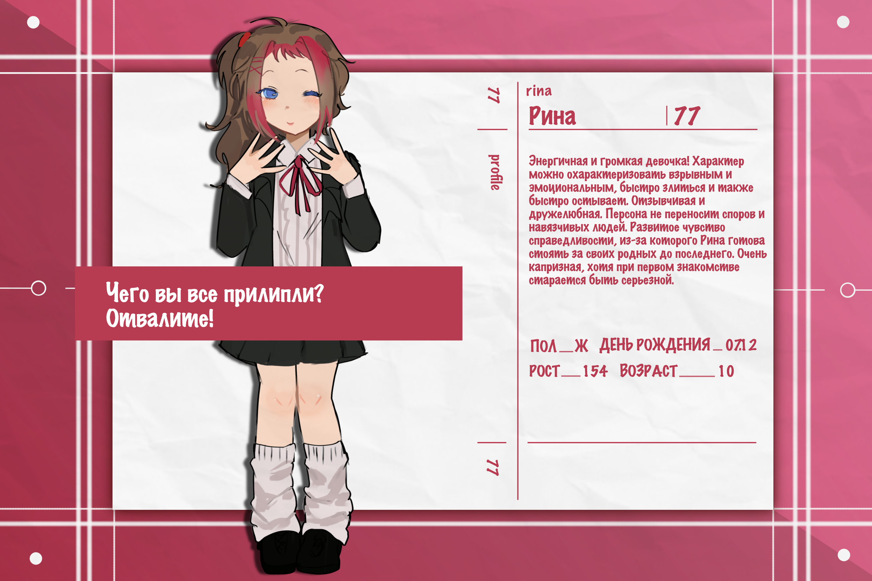 Энергичная и громкая девочка! Характер можно охарактеризовать взрывным и эмоциональным, быстро злиться и также быстро остывает. Отзывчивая и дружелюбная. Персона не переносит споров и навязчивых людей. Развитое чувство справедливости, из-за которого Рина готова стоять за своих родных до последнего. Очень капризная, хотя при первом знакомстве старается быть серьезной.