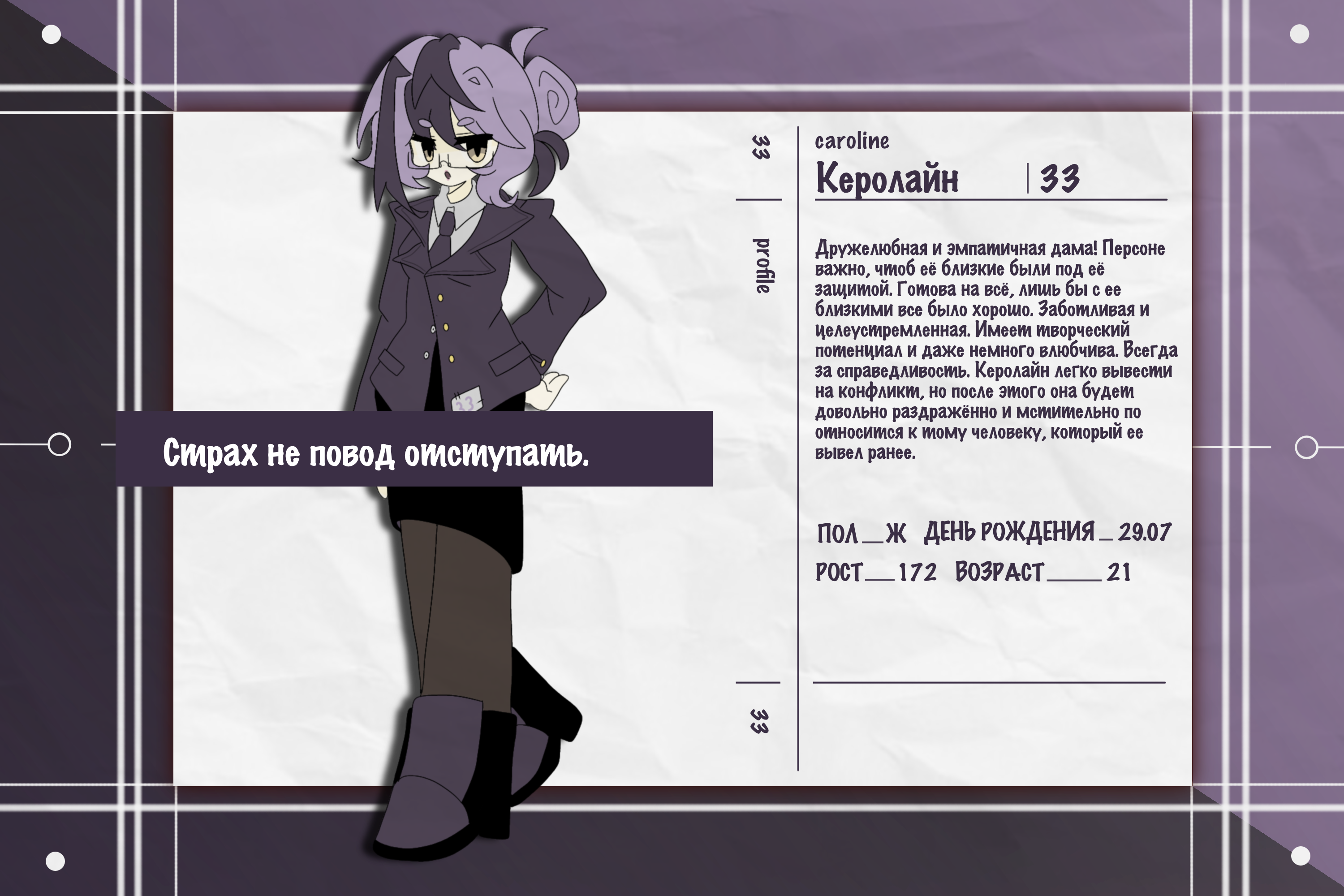 Дружелюбная и эмпатичная дама. Персоне важно, чтоб её близкие были под её защитой. Готова на всё, лишь бы с ее близкими все было хорошо. Заботливая и целеустремленная. Имеет творческий потенциал и даже немного влюбчива. Всегда за справедливость. Керолайн легко вывести на конфликт, но после этого она будет довольно раздражённо и мстительно по относится к тому человеку, который ее вывел ранее.