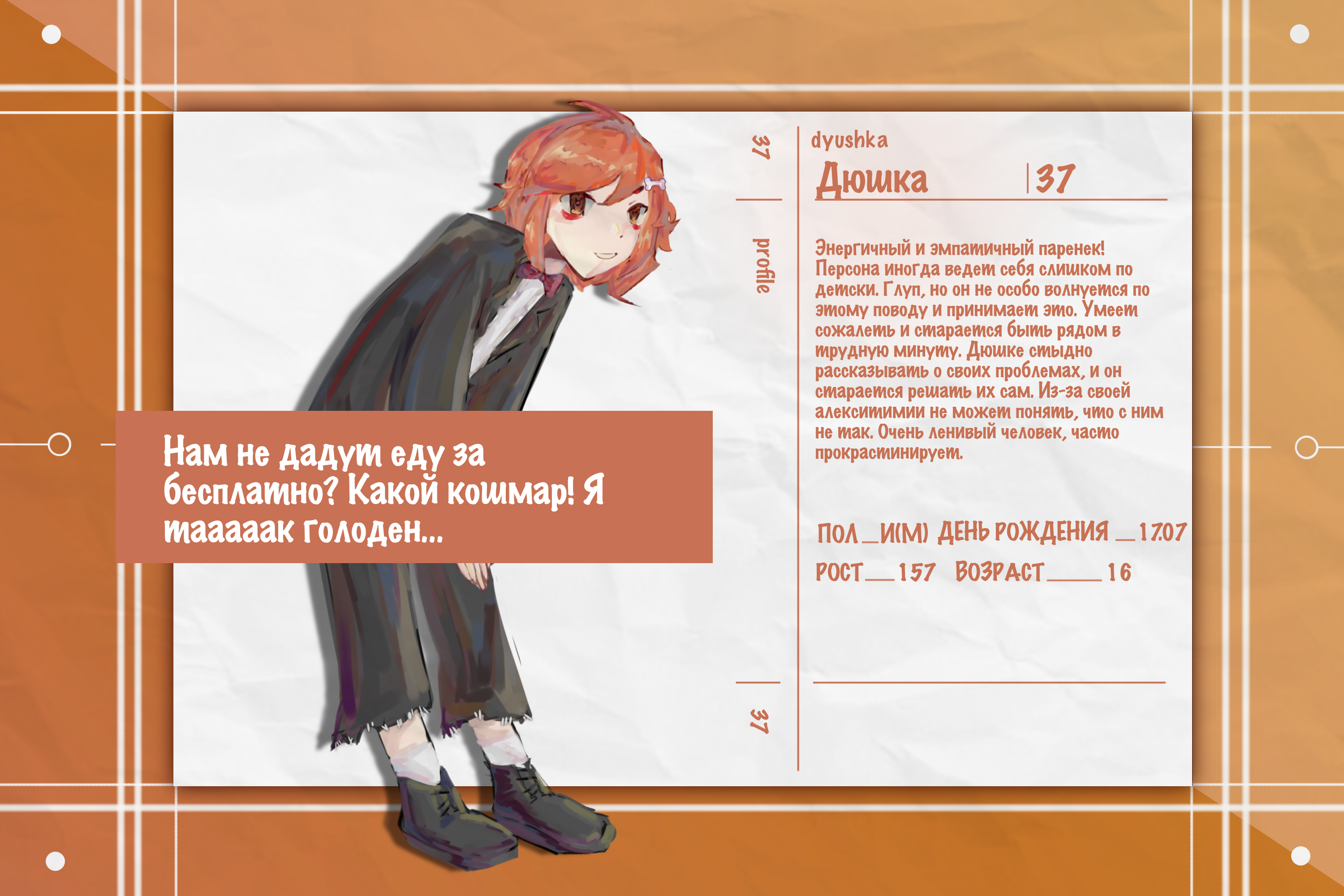 Энергичный и эмпатичный паренек! Персона иногда ведет себя слишком по детски. Глуп, но он не особо волнуется по этому поводу и принимает это. Умеет сожалеть и старается быть рядом в трудную минуту. Дюшке стыдно рассказывать о своих проблемах, и он старается решать их сам. Из-за своей алекситимии не может понять, что с ним не так. Очень ленивый человек, часто прокрастинирует.