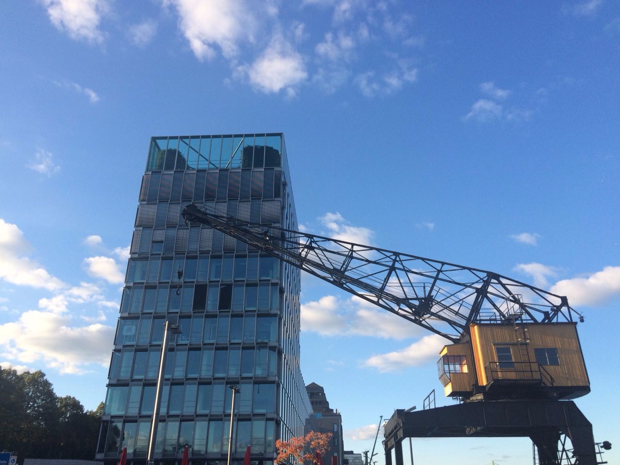 Когда-то во времена кайзеров Кельн был свободным торговым городом, а эту часть берега занимал порт. Сейчас здесь стоят современные здания и офисы таких компаний как Microsoft и Electronic Arts (EA), а раньше башенные краны разгружали торговые суда.