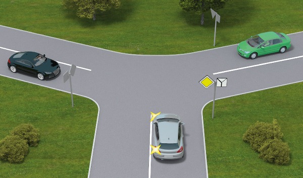 На малюнку бачимо, що сірий і чорний автомобілі перебувають на головній дорозі, зелений — на другорядній. Згідно з пунктом 16.12, сірий автомобіль для чорного буде так званої «перешкодою з правого боку», тому сірий автомобіль проїде перехрестя першим, чорний автомобіль повинен дати йому дорогу і проїхати перехрестя після нього, другим. Зелений автомобіль проїде перехрестя останнім, третім.