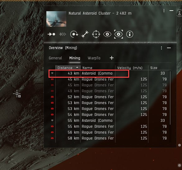 Переключаемся на кнопку майнинг и находим ближайший астероид