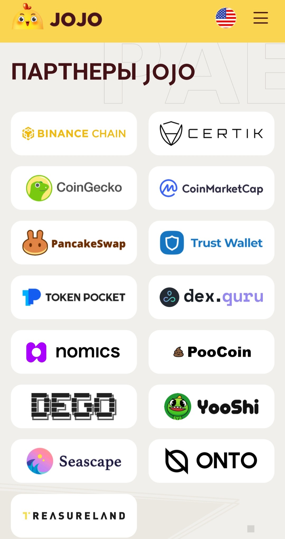 Уже сейчас JOJO является партнерами PancakeSwap, CoinGecko, Trust wallet и т. д. скриншот ниже :