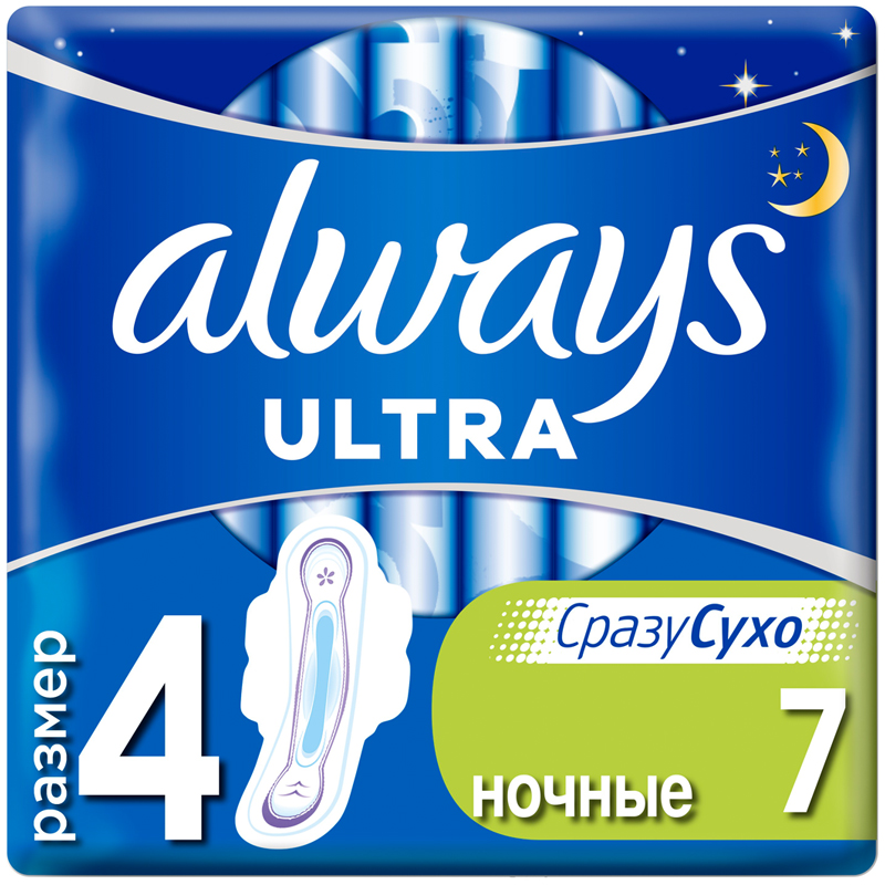 Гигиенические прокладки Always Ultra Ночные (Размер 4) с системой СразуСухо мгновенно впитывают влагу и удерживают ее внутри . Гигиенические прокладки Always Ultra толщиной 3 мм дарят невероятное ощущение комфорта и обеспечивают защиту во время менструации .