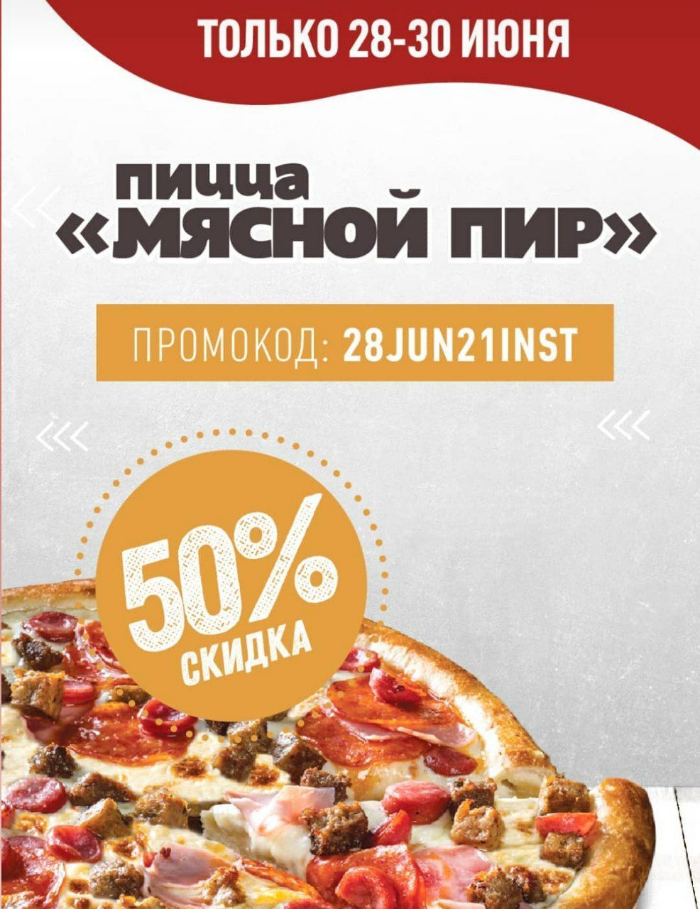 Переходим на сайт Сити пицца заказываем пиццу Мясной пир 30см и вводим промокод: 28JUN21INST, 28JUN21VK