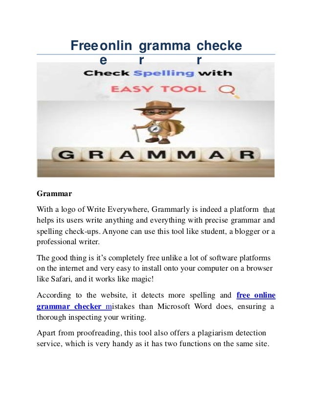 The World's Best Online Proofreader . Grammarly's online proofreader automatically detects grammar, spelling, punctuation, word choice and style mistakes in your writing . Start Proofreading It's free . "Grammarly quickly and easily makes your writing better ." .