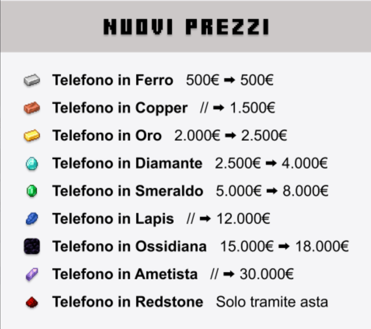 ⇢ Estetica del nome : I telefoni hanno tutti un nome con la T di "Telefono" maiuscola poi il materiale con l'iniziale in minuscola. Chiediamo dunque di mettere in maiuscolo pure il materiale (Es : "Telefono Ferro" invece di "Telefono ferro") + Cambiare il nome del "Telefono rosso" in "Telefono Redstone".