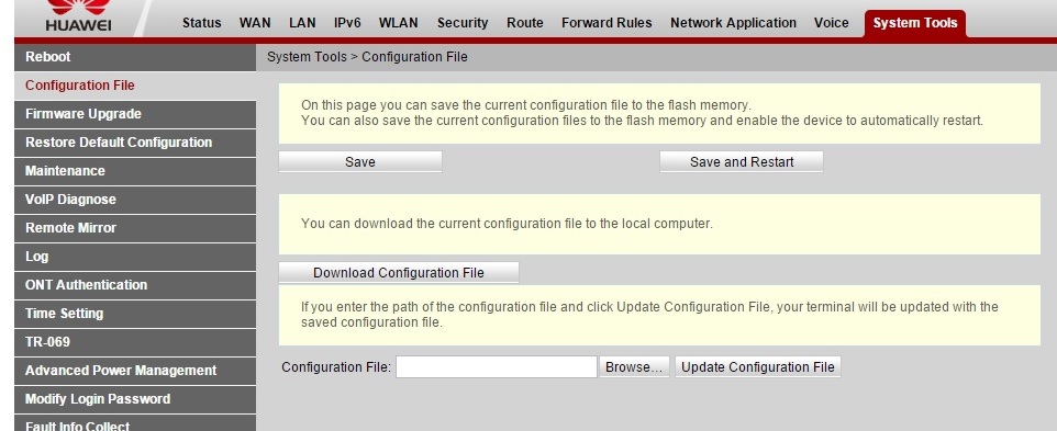 Для того зайдите в раздел «Configuration File» и сохраните конфигурационный файл на жесткий диск . Попав в веб-интерфейс оптического модема Huawei , переходим в раздел «System Tools» => «Firmware Upgrade»: Затем нажимаем кнопку «Browse» и выбираем файл прошивки . Затем надо нажать кнопку « Update Firmware»: