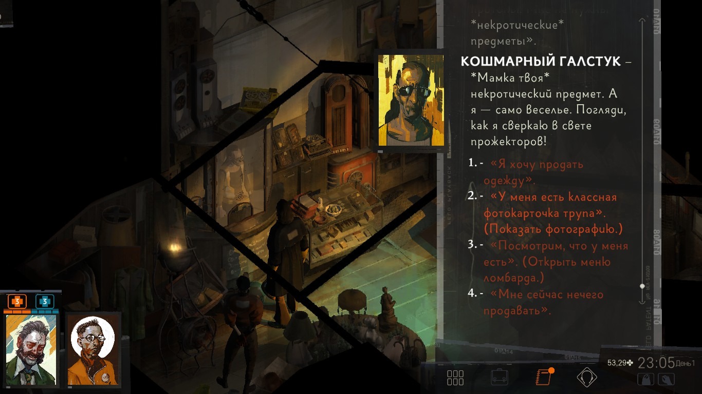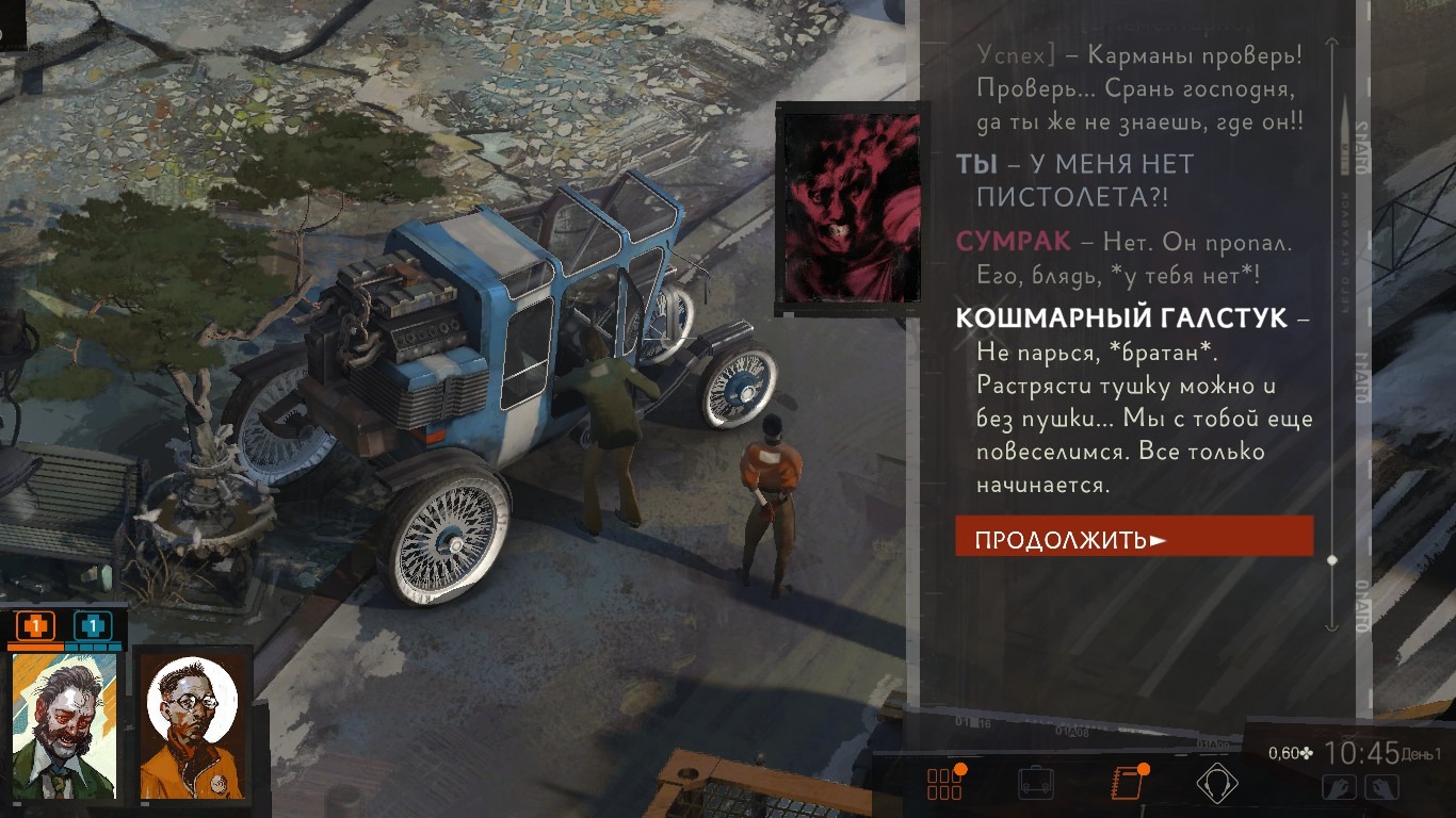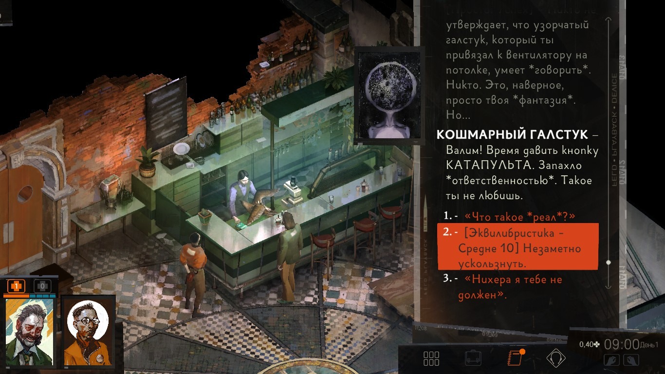 И вот вся эта какофония – это не только “запланированный экспириенс”, но и результат множество скрытых проверок. Если вы их проходите, вам отвечает тот ваш навык, бросок на который вы прокинули. То есть говорить с вами будут те навыки, которые вы прокачиваете. Это, согласитесь, делает диалоговую систему какой-то запредельно сложной и запутанной.