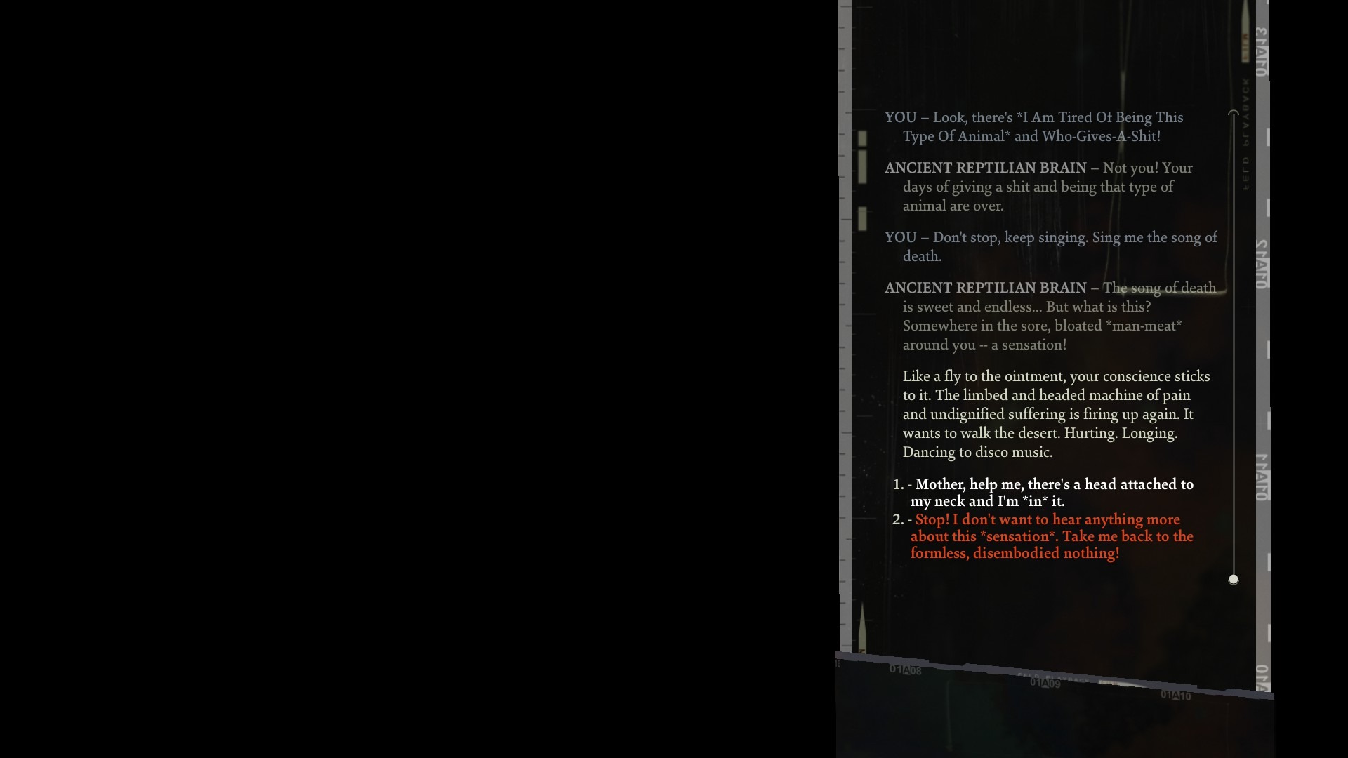 То есть, если у вас прокачана, скажем “Внутренняя империя” (что бы это ни значило), с вами будет разговаривать ваш уродливый галстук. Если у вас прокачана “Драма”, она будет заботливо сообщать, врет ли ваш собеседник или нет. С ней могут поспорить “Логика” и “Риторика”. Это не говоря о том, что с героем еще периодически общаются его Рептильный мозг и Лимбическая система.