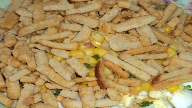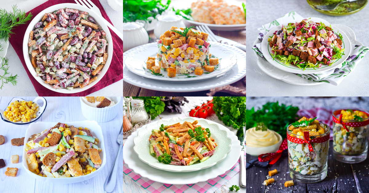 Простой салат с сухариками и колбасой 111 фото