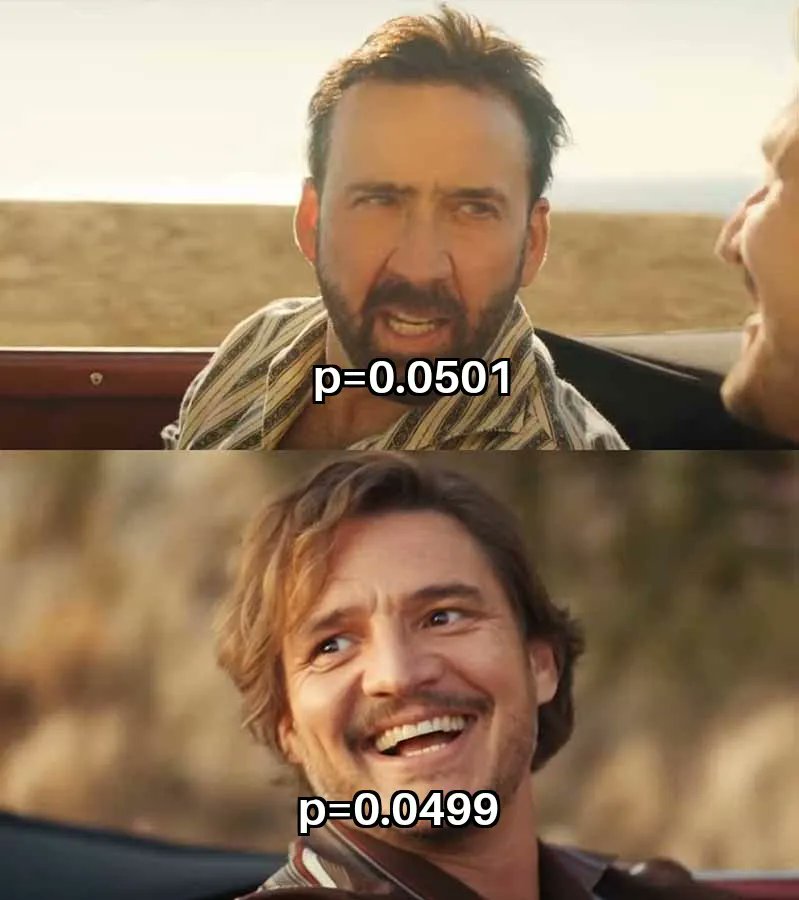 И я пишу именно α, а не 0.05. Уровень значимости мы задаём сами, можем хоть единицей сделать, хотя тогда 100% совершим ошибку 1 рода. Так что все договорились, что 0.05 или на крайняк 0.01 будет ̶с̶о̶м̶н̶и̶т̶е̶л̶ь̶н̶о̶,̶ ̶н̶о̶ ок. И вот какая штука, мы сначала сами поставили границу, а потом получили, что если у нас p=0.051, то различий нет, а если р=0.049, то различия есть. Разница мизерная, а результат диаметрально противоположный. Поэтому p-значение в частности и весь описываемый в классических учебниках подход к статистике всё чаще подвергается критике и в качестве альтернативы рассматривается байесовская статистика. Особенно активно это развивается для областей, связанных с работой с большими данными и машинным обучением. Очень понравилась вот эта статья на Хабре, в котором эта проблема отражена в диалоге между байесовцем и учёным.