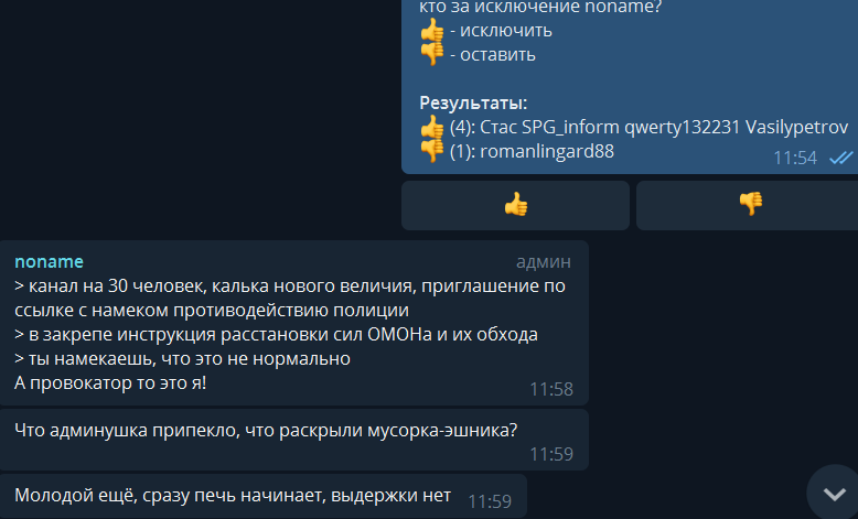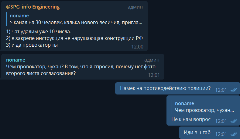 Аналогичная ситуация была и перед пятым мая (перед митингом "он нам не Царь", организованным Навальным), когда в питерском чате СПГ стали писать с аккаунтов, которые или только что вступили в чат, или все время молчали. Смысл сообщений был примерно тот же - будут задержания, вы подобие "нового величия", админы эшники и т.д.