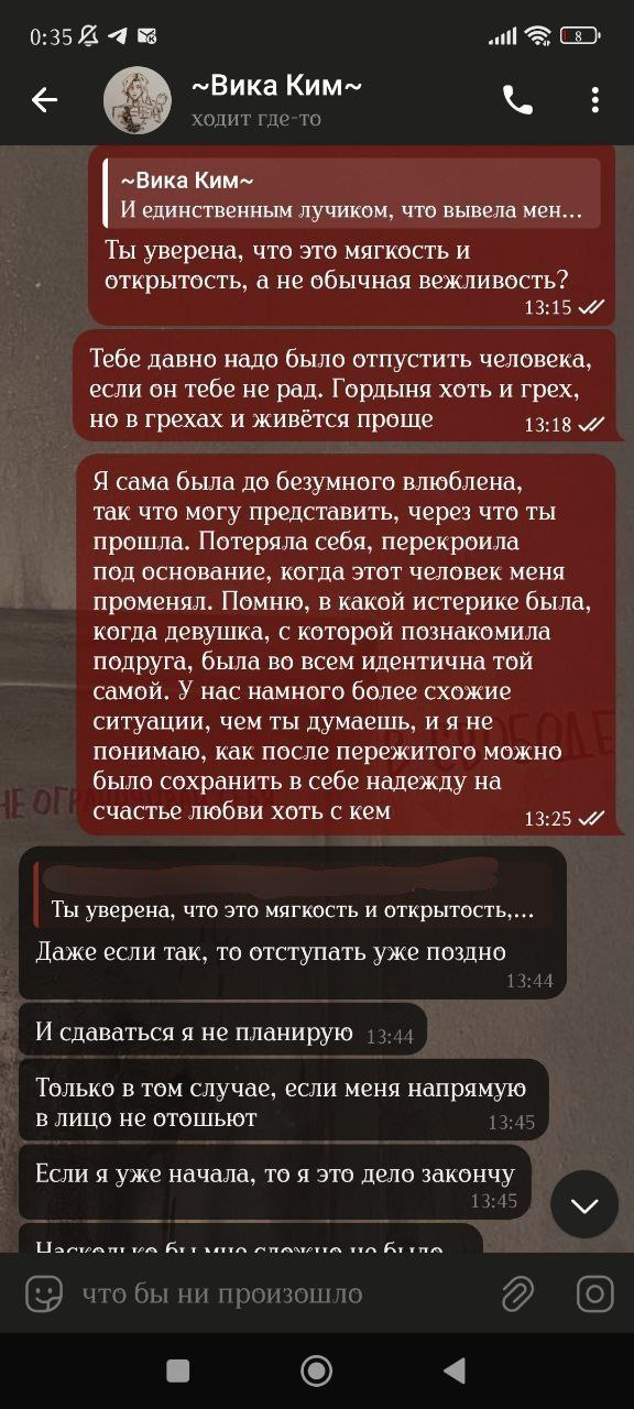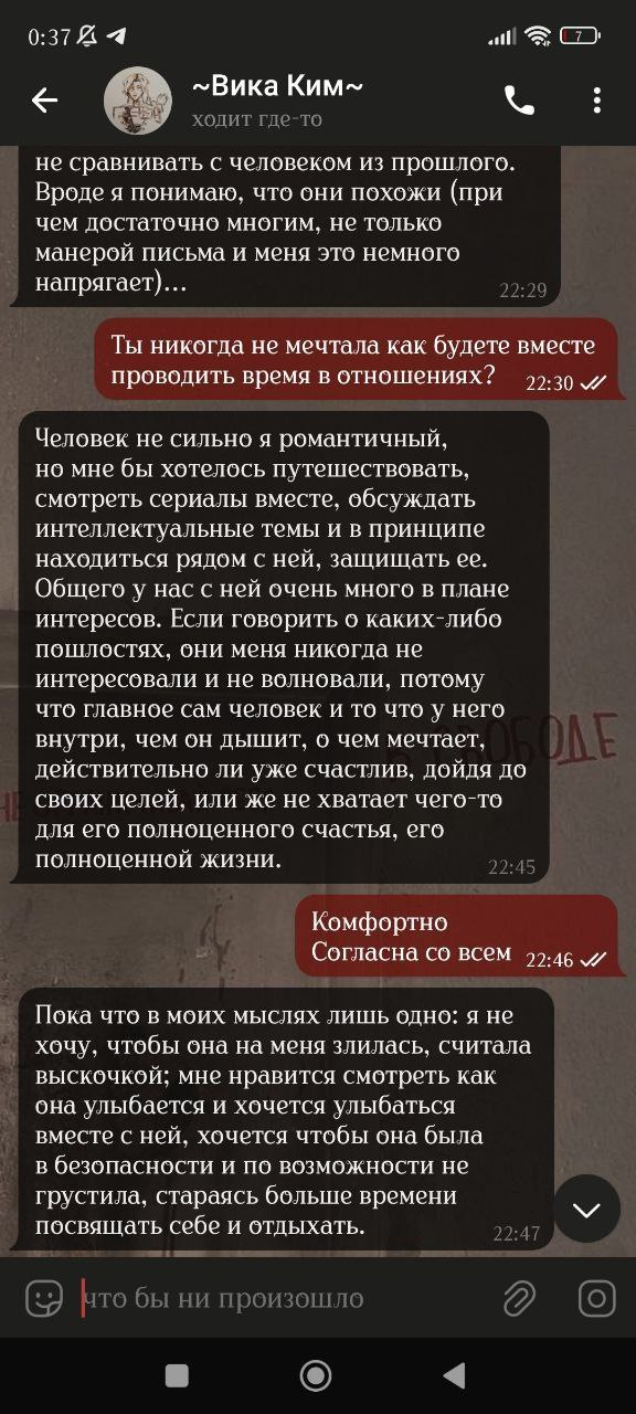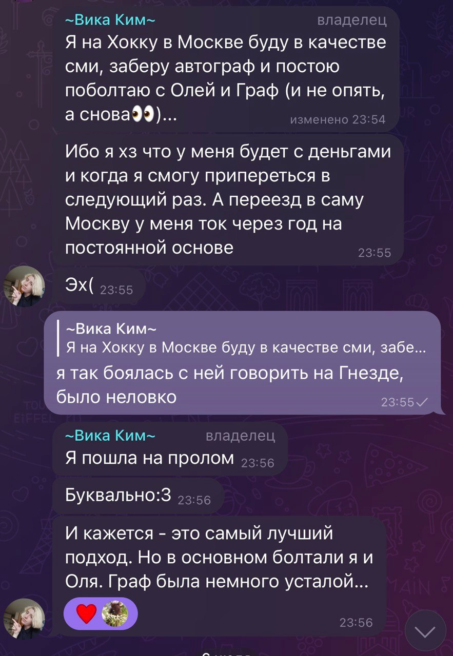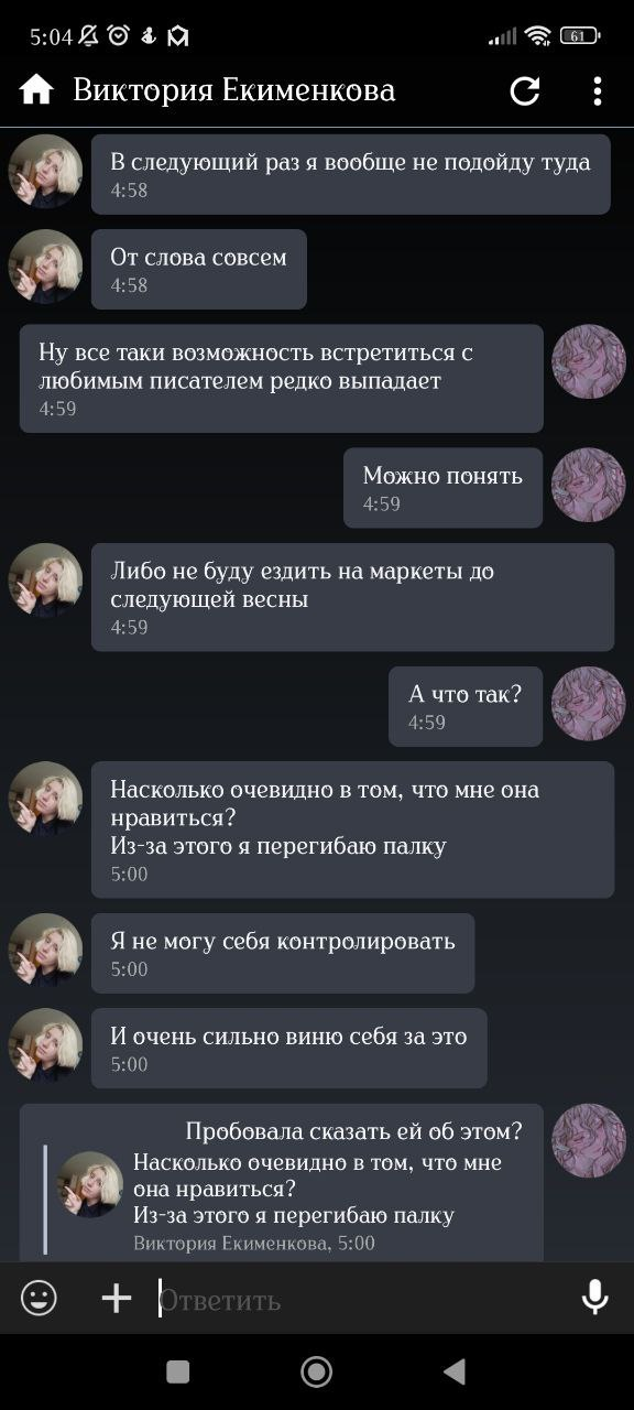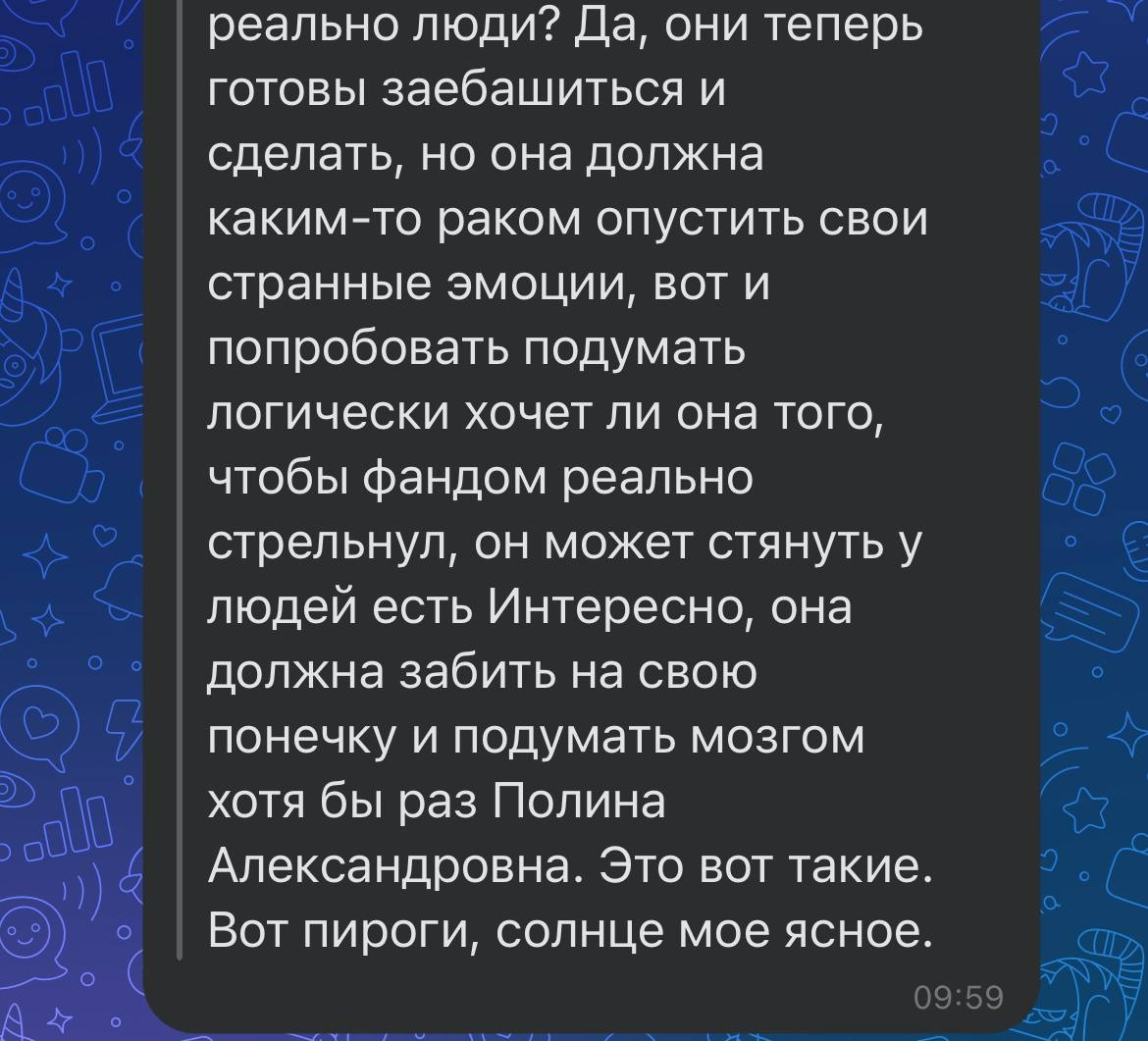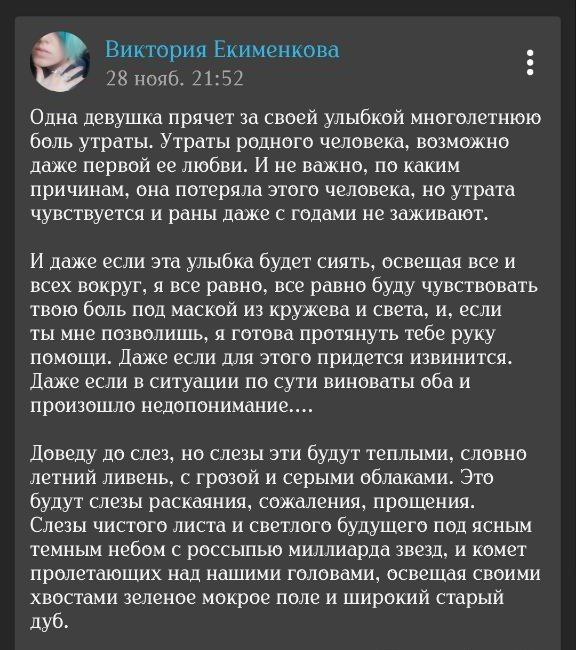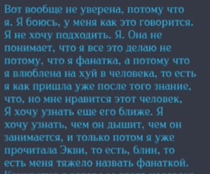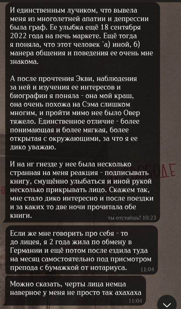 Старый пруф из начала всей истории (развертка аудио, поэтому криво). Сейчас Вика убеждает всех, что она трудится ради фандома, а я злая на нее не реагирую, но это никогда не было так: она увидела меня на маркете, вкрашилась, и только затем прочитала книги (в целом изучила про меня все, в лонгриде есть скрины и с этим). Вика никогда не говорила о любви к книге, все делалось лишь ради моего расположения, и продолжается непонятно ради чего.