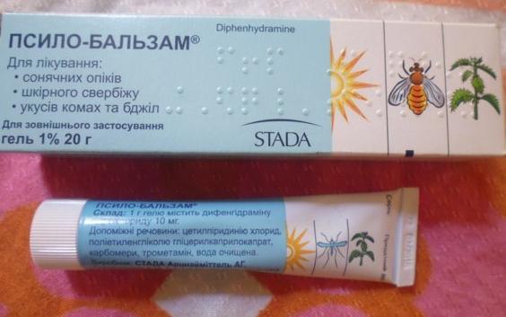 Псило-бальзам Основным действующим компонентом этой мази в виде геля является дифенгидрамин, который в народе называется димедролом . Средство прекрасно справляется с отечностью, возникшей в результате укуса, и снимает зуд благодаря своему охлаждающему эффекту . Данный препарат противопоказан детям, возраст которых менее 1 года .
