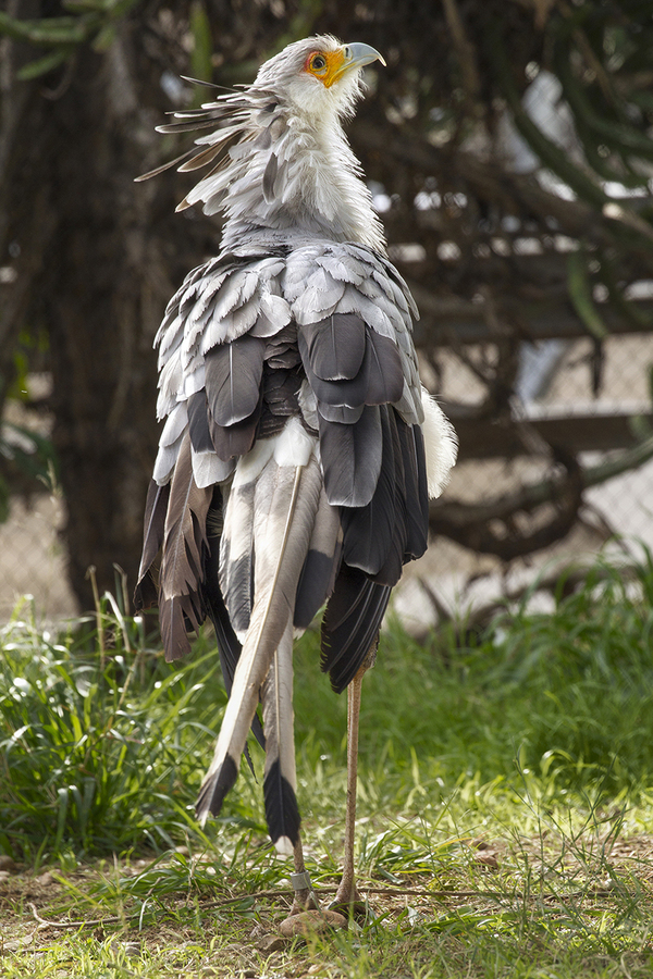 Птица-секретарь имеет скромный окрас оперения . Почти вся серая, она чернеет ближе к хвосту . Участки у глаз и клюва выглядят оранжевыми, но не благодаря перьям, а, напротив, за счет их . . .