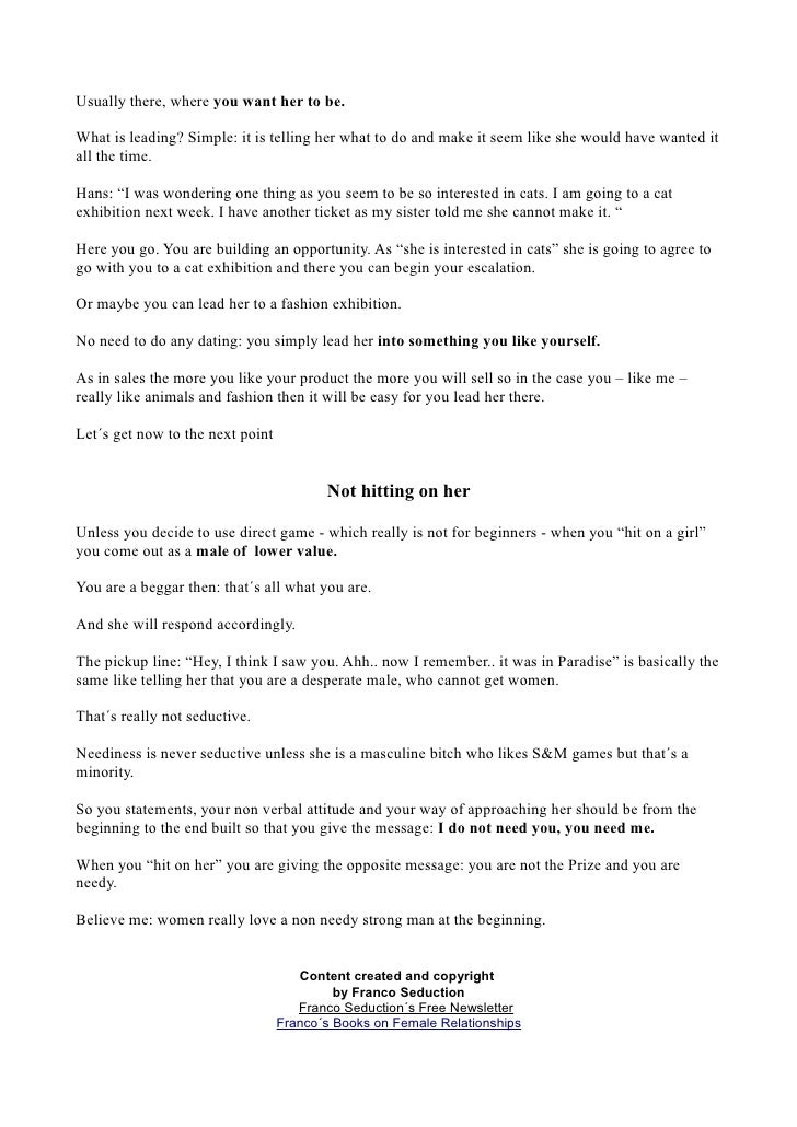 5th message : Suggest a date and number close . - To fuck her - 1st message : Push and pull with a qualifier . 2nd message : Sexual bantering to create sexual tension . (Role playing, sexual innuendos, sexual topics, etc . .) 3rd message : Future projecting to gauge her reaction .