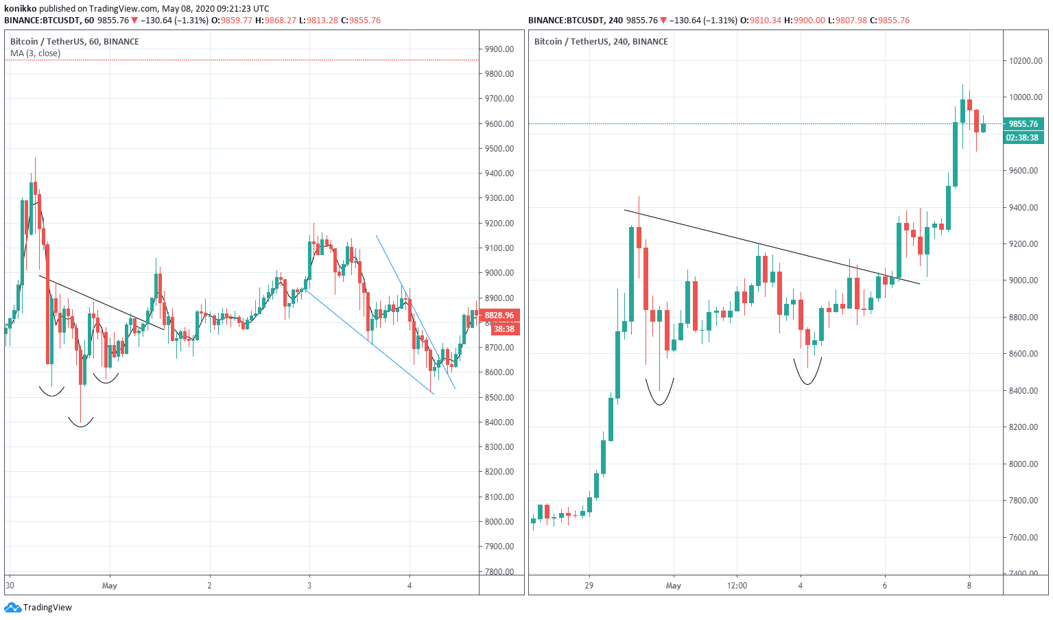After a while, bullish signs appeared, two H&S neckties with breaking higher and one descending wedge . Obviously, I would exit trade on the nearest resistance level , which was $10K