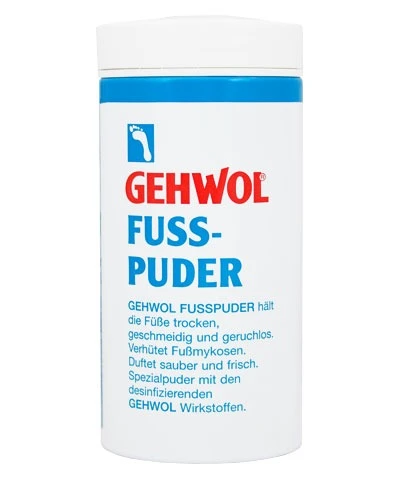 Пудра Геволь-мед Gehwol med Foot Powder - cпециальная пудра-адсорбент для решения проблемы влажных ног (в составе оксид цинка), грибка и неприятного запаха. Пудра предупреждает болезни ног, связанные с излишком влаги и процессом разложения пота на поверхности кожи, препятствует раздражению и воспалению кожи ног. Она впитывает влагу с поверхности кожи и помогает сохранять ноги сухими, избавляет от неприятного запаха, дезодорируя кожу. Освежающие компоненты (ментол) создают ощущение легкости и прохлады. Пудра также придает коже ощущение нежности и бархатистости. Особенно рекомендуется как защитное от инфицирования средство в открытой обуви.