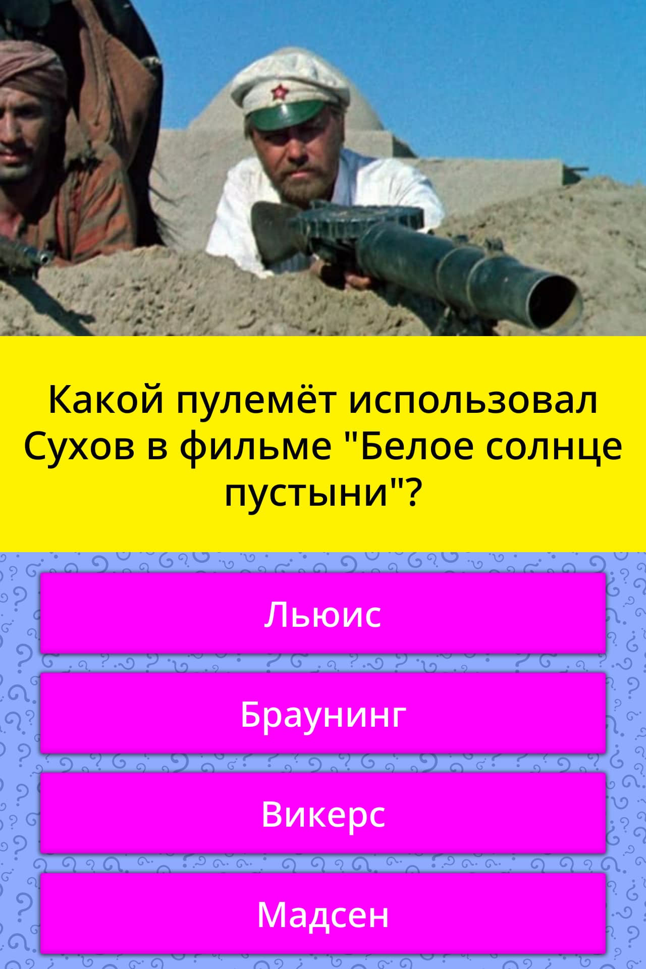 На этом фото, кадре из кинофильма "Белое солнце в пустыни", которое выложил автор вопроса, красноармеец Федор Иванович Сухов, стреляет из легендарного, английского ручного пулемета Льюиса .