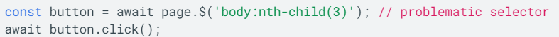 Такие сценарии могут быть хрупкими и подвержены изменениям исходного кода. Предположим, что вы используете Puppeteer для автоматического тестирования веб-приложения, содержащего третий дочернего дочерний элемент body: <button>Submit</button>.