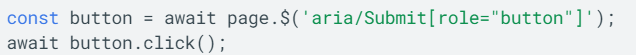В приведенном выше примере тестового скрипта мы могли бы использовать селектор aria/Submit[role="button"] для выбора нужной кнопки, где Submit относится к доступному имени элемента: