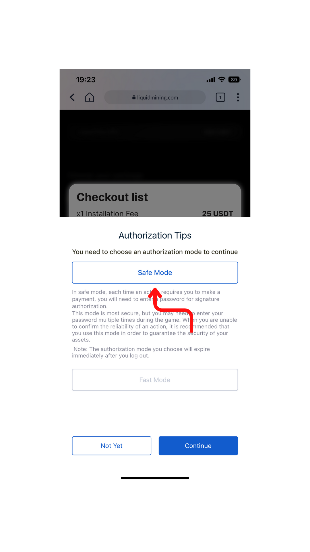 There are two modes available for authorizing your transaction: Safe Mode and Fast Mode. In Safe Mode, you need to enter a password each time you are required to make a payment, making it more secure. This ensures that every action needing payment authorization requires an authoritative password to be entered. For the purpose of this guide, we will use Safe Mode as an example.