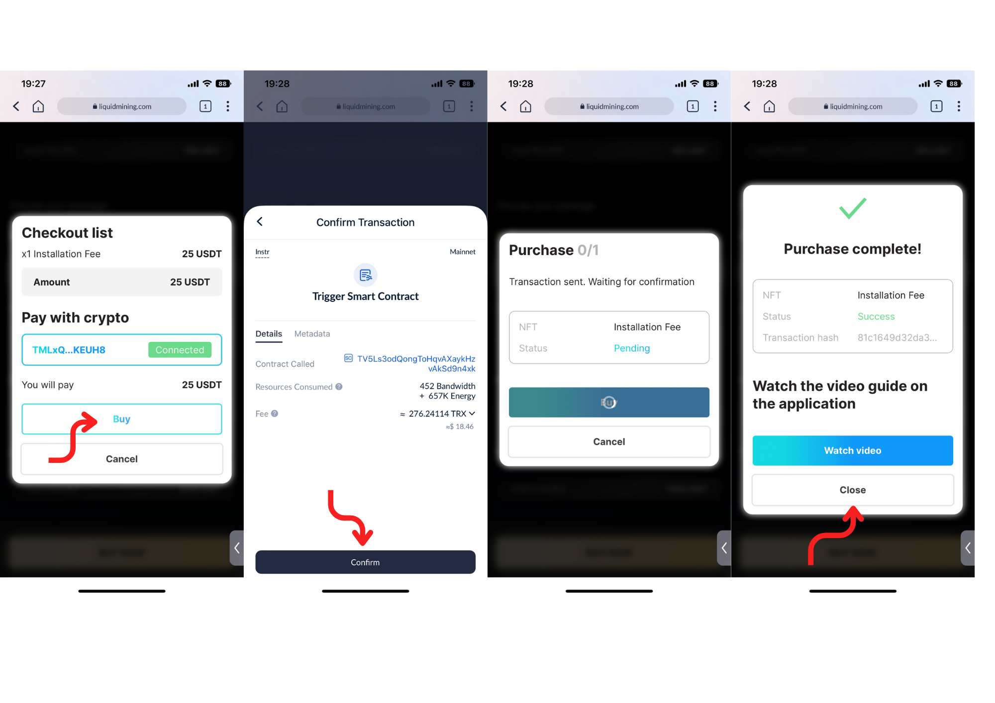 Click the "Continue" button to finalize the purchase. You will then see a pop-up window indicating that your purchase is complete. At this point, you can either watch a video tutorial on the Liquid Mining App or close the window to proceed with Installing your purchased NFT on the Liquid Mining App.