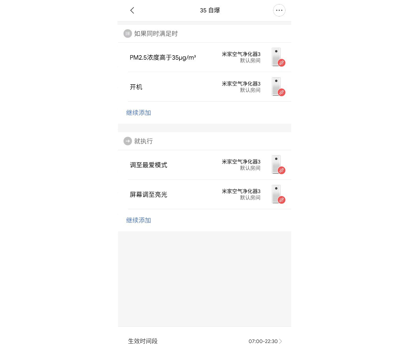 我猜智米客服可能会说,对于您这样的需求,如果想要更激进的模式调整,您可以在米家 APP 的“智能”选项卡进行操作,比如这样: