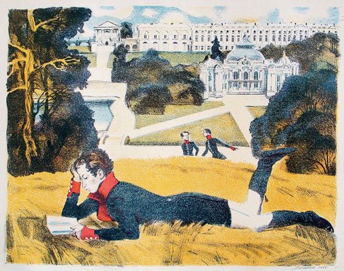 Пушкин-лицеист в Царскосельском парке Николай КУЗЬМИН . Александр Пушкин лежащий Виталий ГОРЯЕВ . Торжество в Царскосельском лицее в 1836 году по поводу 25-летия лицея Неизвестный художник . Кому ж из нас под старость день лицея торжествовать придется одному?